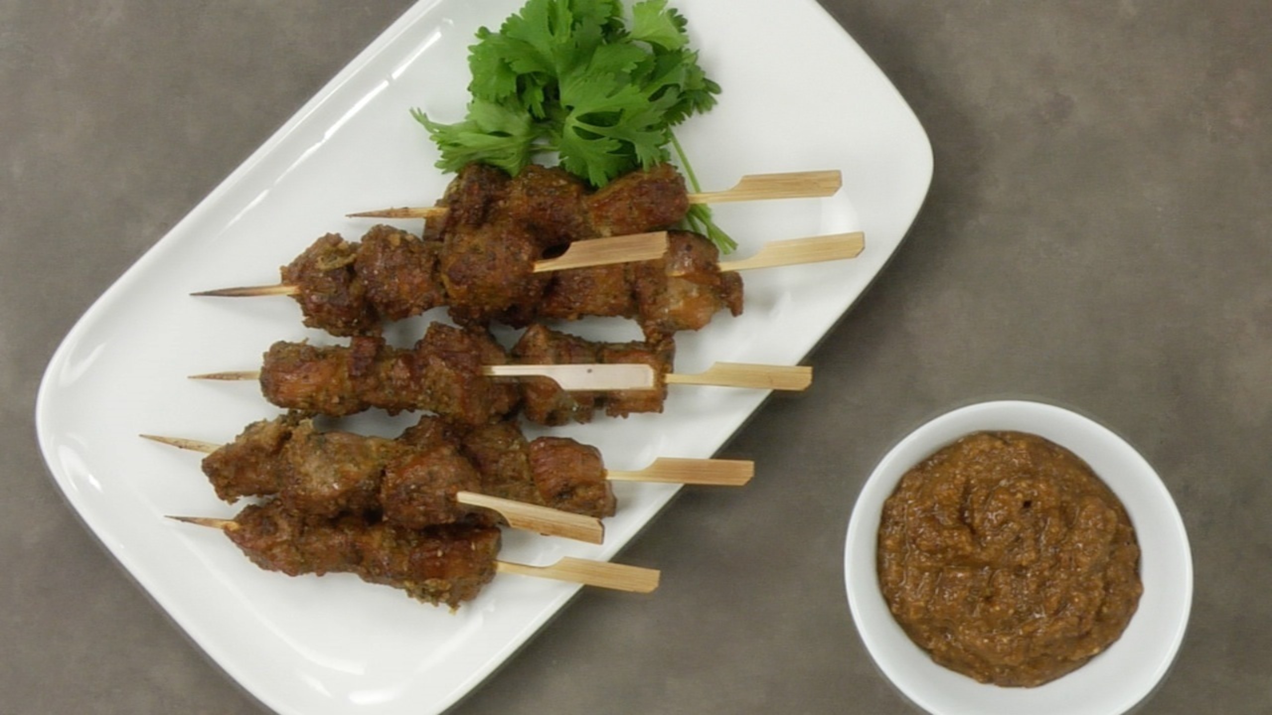 To cook the satays, preheat your oven to 400°F (205°C). Place 3 or 4 pieces of “beef” onto each skewer and set onto a parchment-lined baking tray.