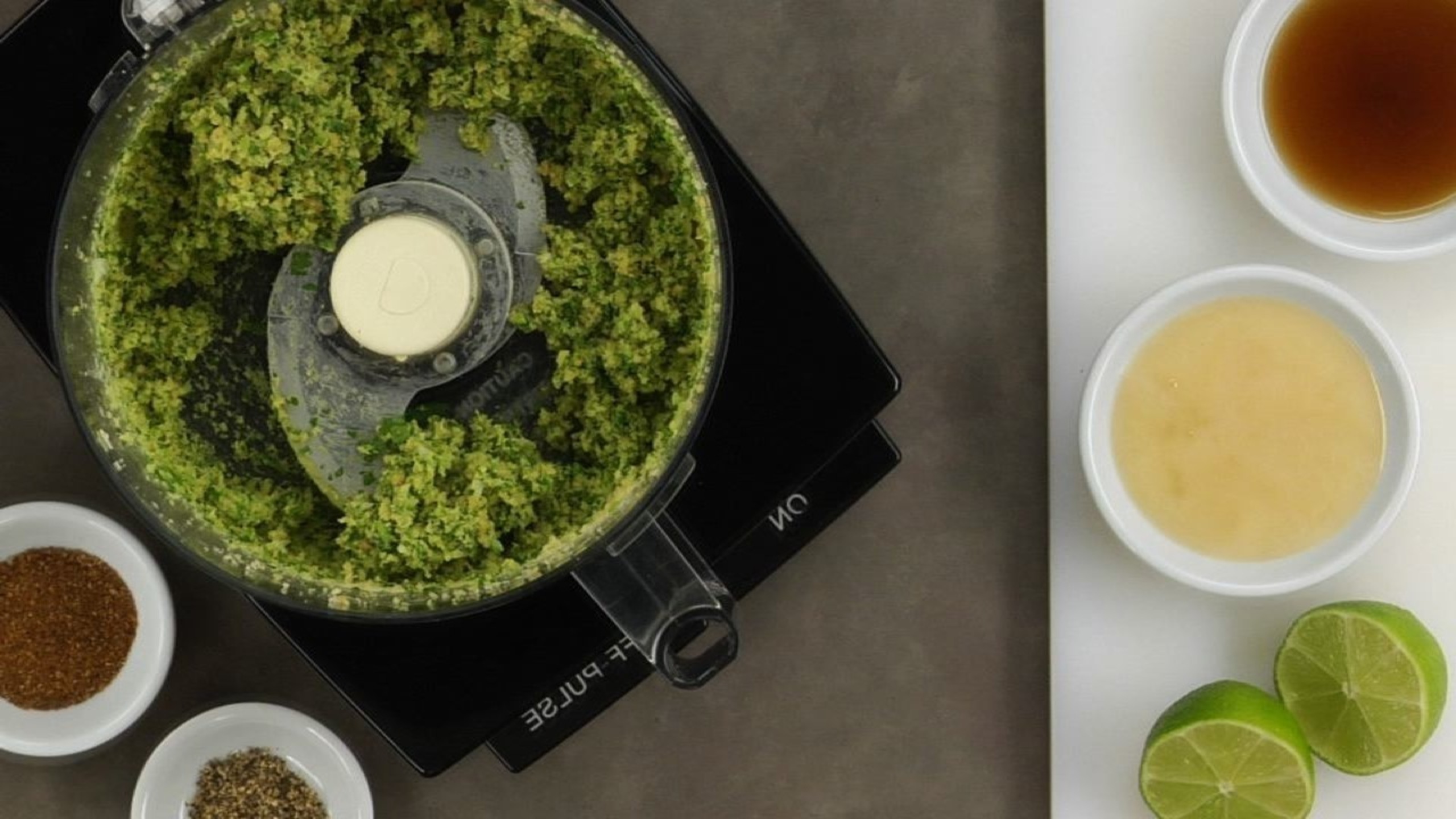 Add the peanuts and pulse a few times. Next, add the green onions and cilantro and pulse again. Add the honey, Fish-less Fish Sauce, kecap manis, lime juice, pepper and ground spices and purée. Lastly, add the non-dairy butter and vegetable stock. Pulse again and set aside while you prepare the “beef.”