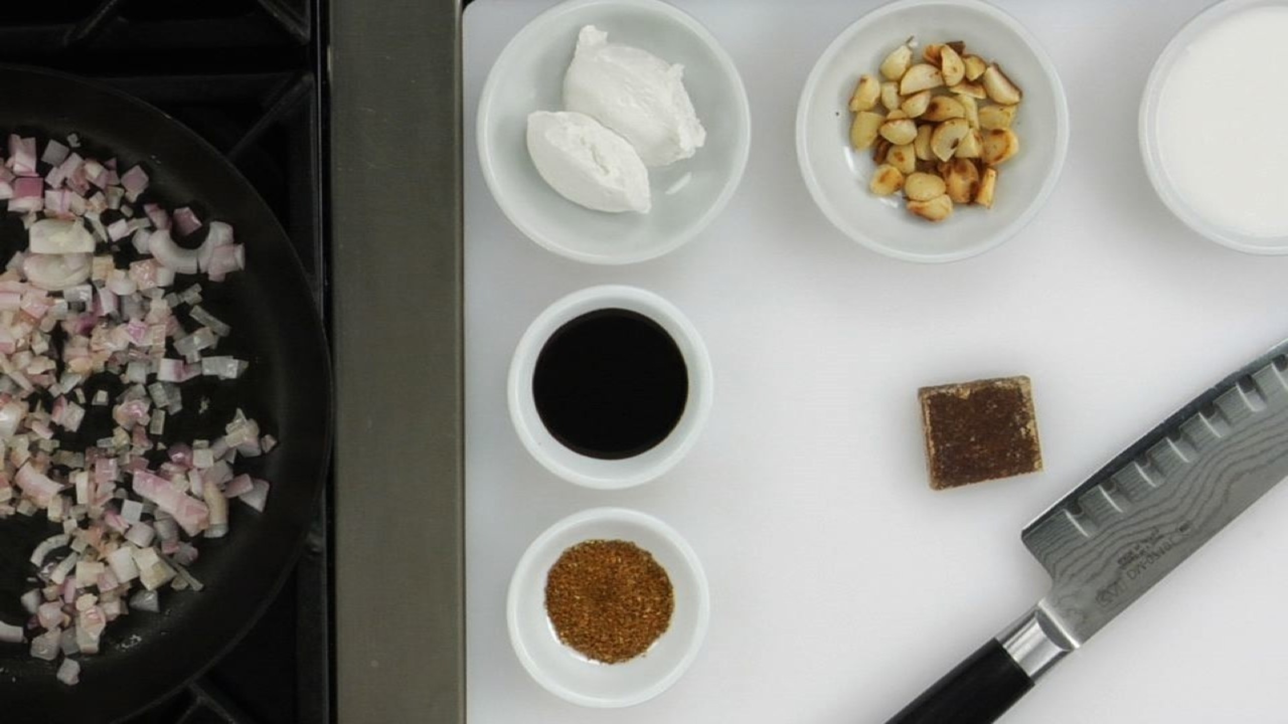 Dice the onion and shallot. Add the oil to the pan and sauté over medium heat for 3 or 4 minutes or until golden. Add the spices and coconut cream and let cook for a few more minutes. Add the coconut milk, palm sugar, kecap manis, salt and pepper. Cook for another few minutes before setting aside to cool slightly.