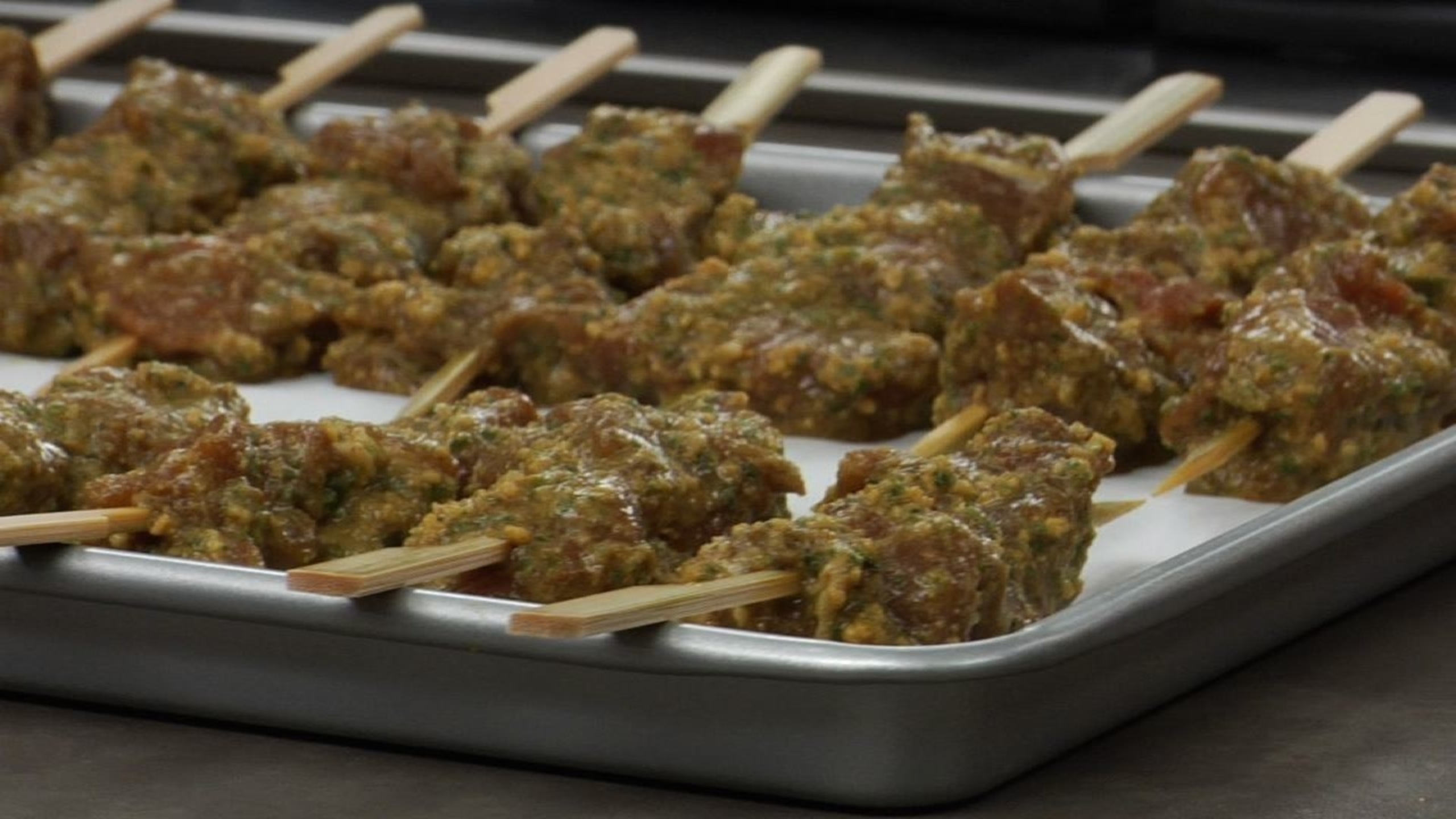 Cut the “beef” into bite-sized cubes. Place into a casserole dish, add the marinade and mix. Cover and let marinate in the refrigerator for a minimum of 20 minutes, preferably longer. The longer they marinate, the stronger the flavor. Soak the wooden skewers in cold water.