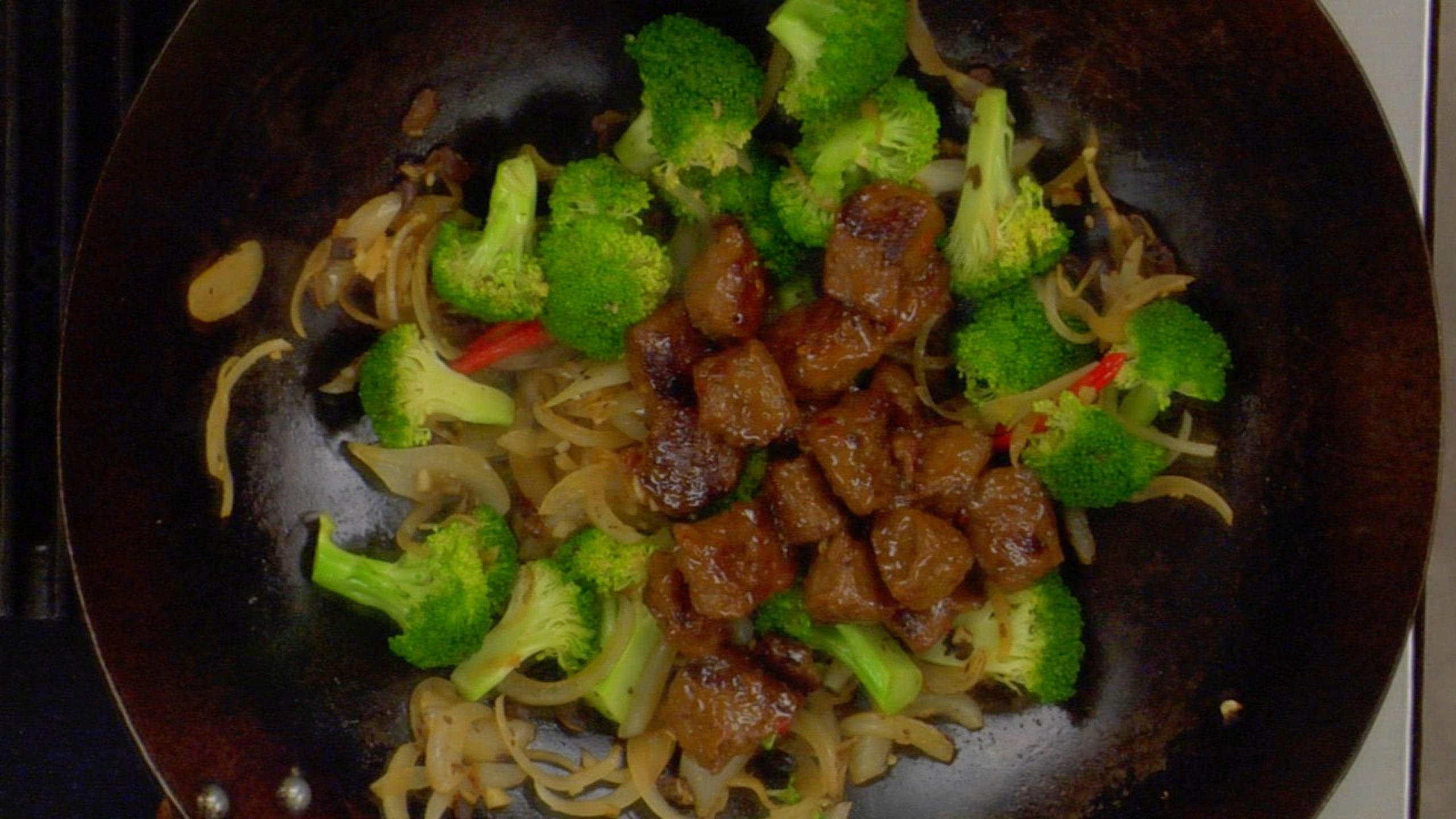 Cook for 30 seconds, then add the broccoli and chilies. Toss a few times, then add a bit of stock and toss again. At this point, cover the wok for a few minutes, to help steam the broccoli.