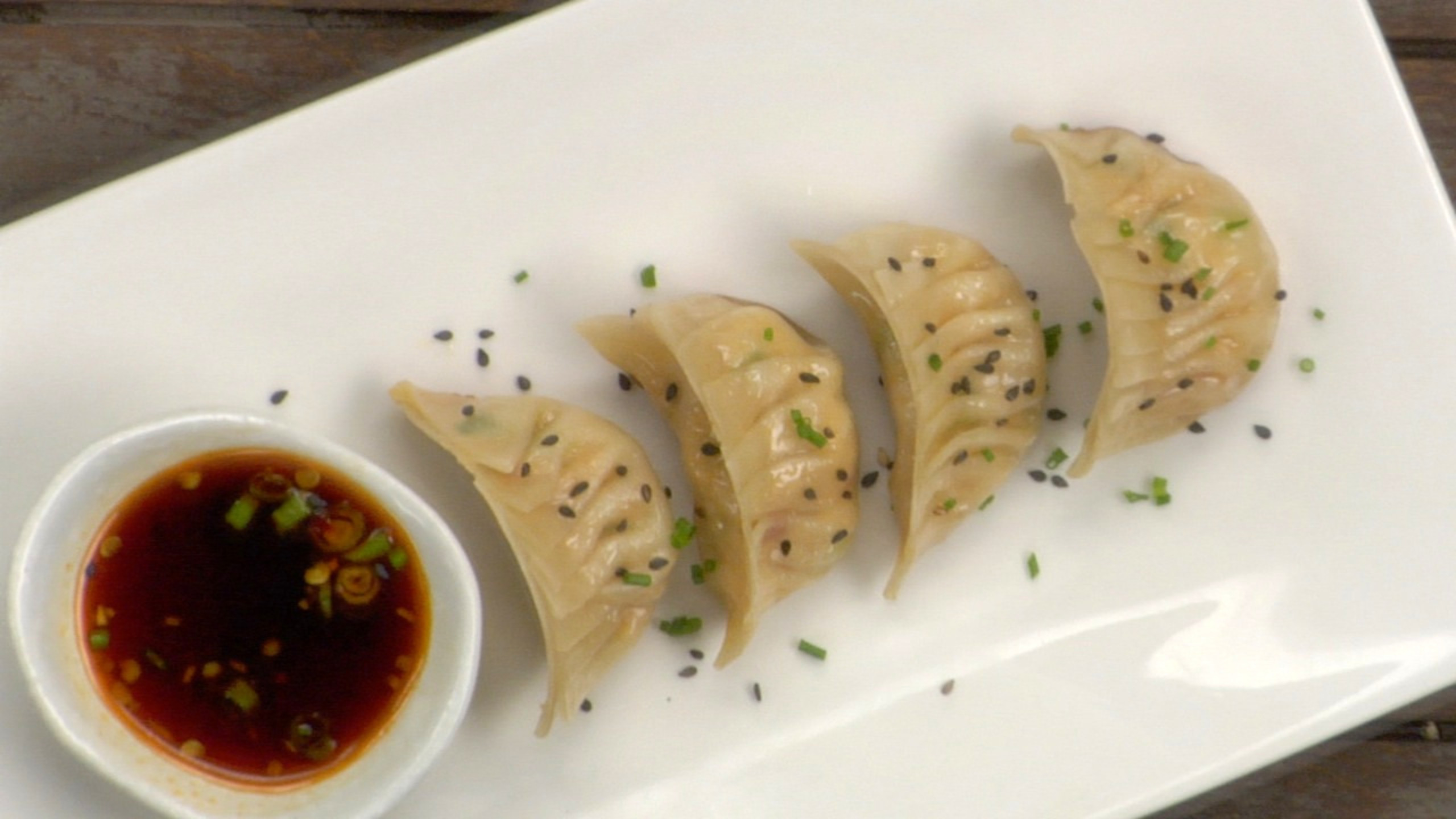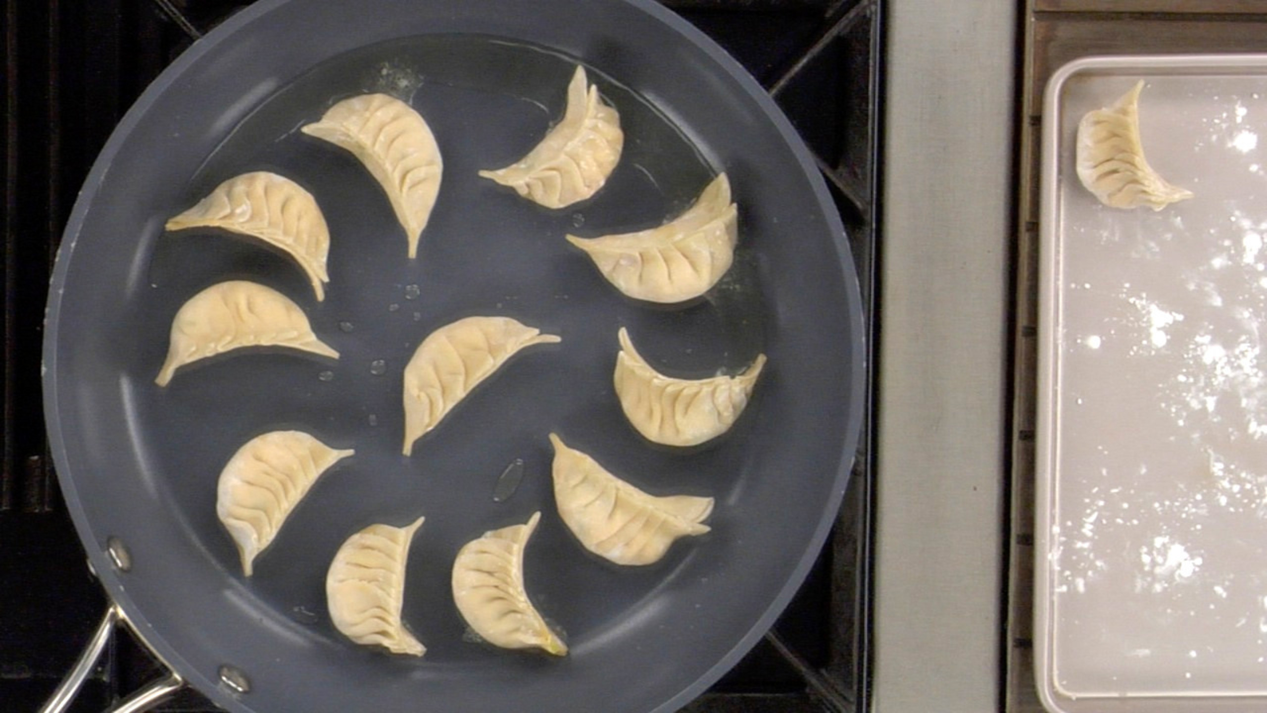 To cook the dumplings, in a fry pan on medium heat, add a small amount of oil, or spray oil on the pan and sear dumplings until just golden on the bottom. Add a splash of water to the pan, cover and reduce the heat. Allow the dumplings to steam for about 3 to 4 minutes or until they are heated through.