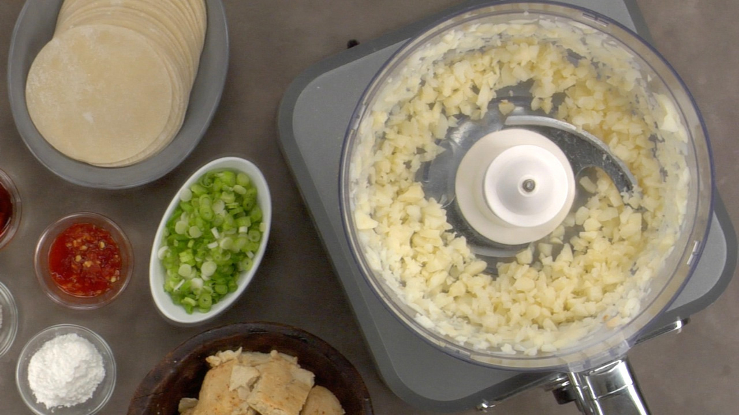 In a food processor, add the water chestnuts and pulse to a coarse consistency. Add the Gardein and pulse until coarsely minced.