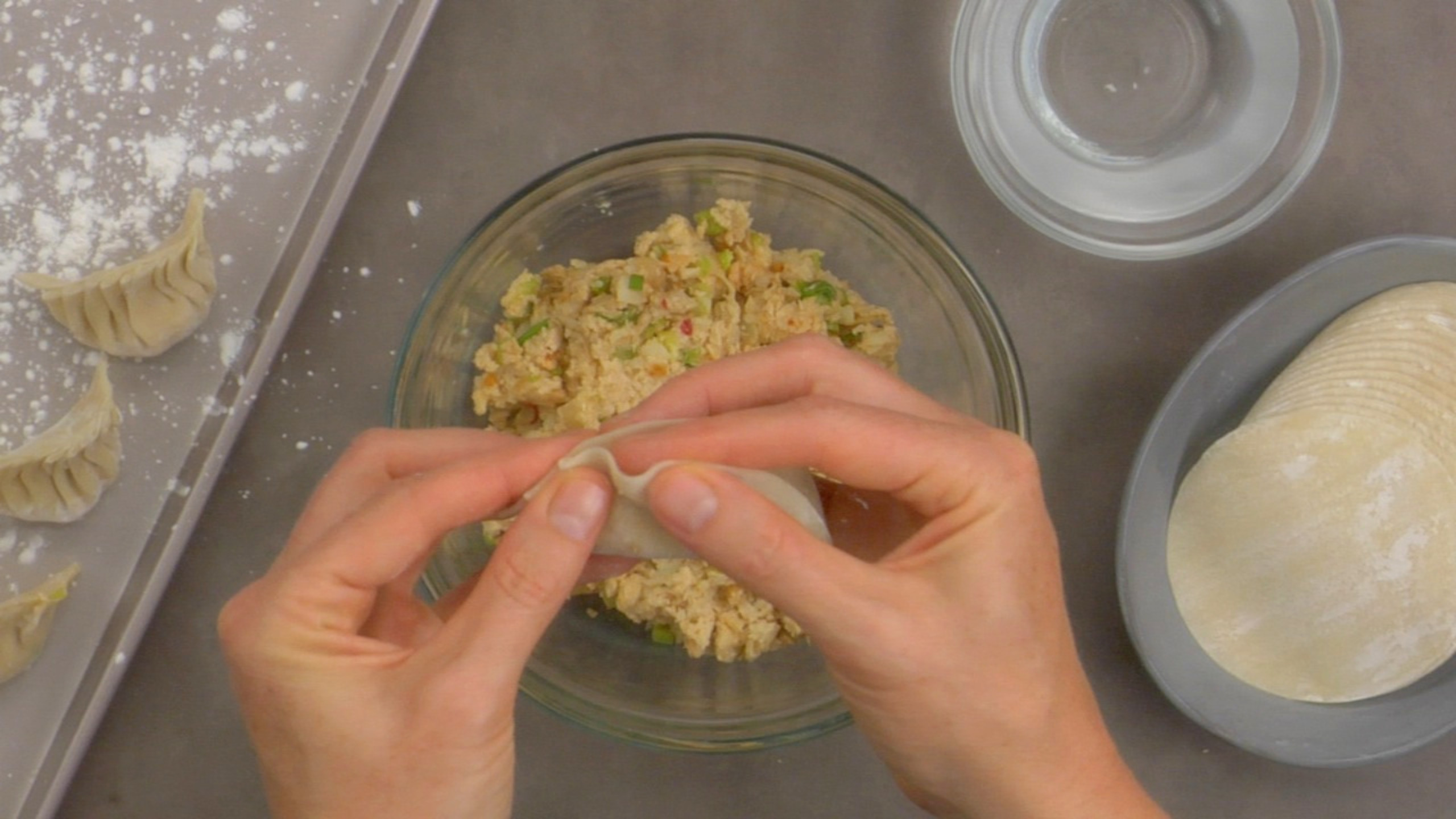 To assemble the dumplings, place about a tablespoon of dumpling filling in the center of each dumpling skin. Using a small bit of water on your finger, moisten around the edge of half of the skin (more traditional). Fold it into a taco shape. Starting with one corner of the skin facing you, begin crimping around the edge until the dumpling is sealed.