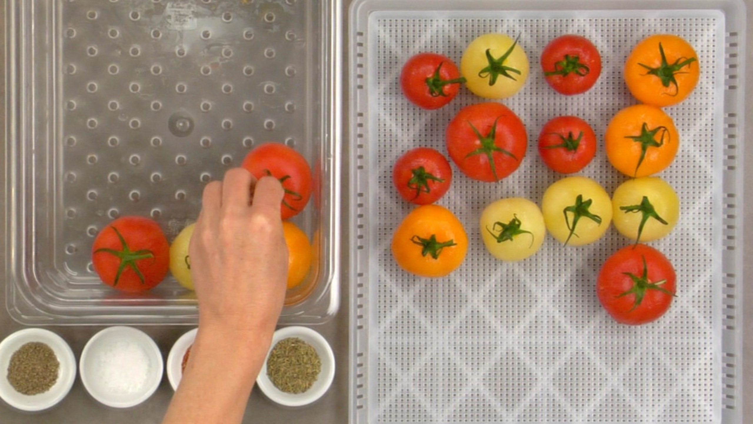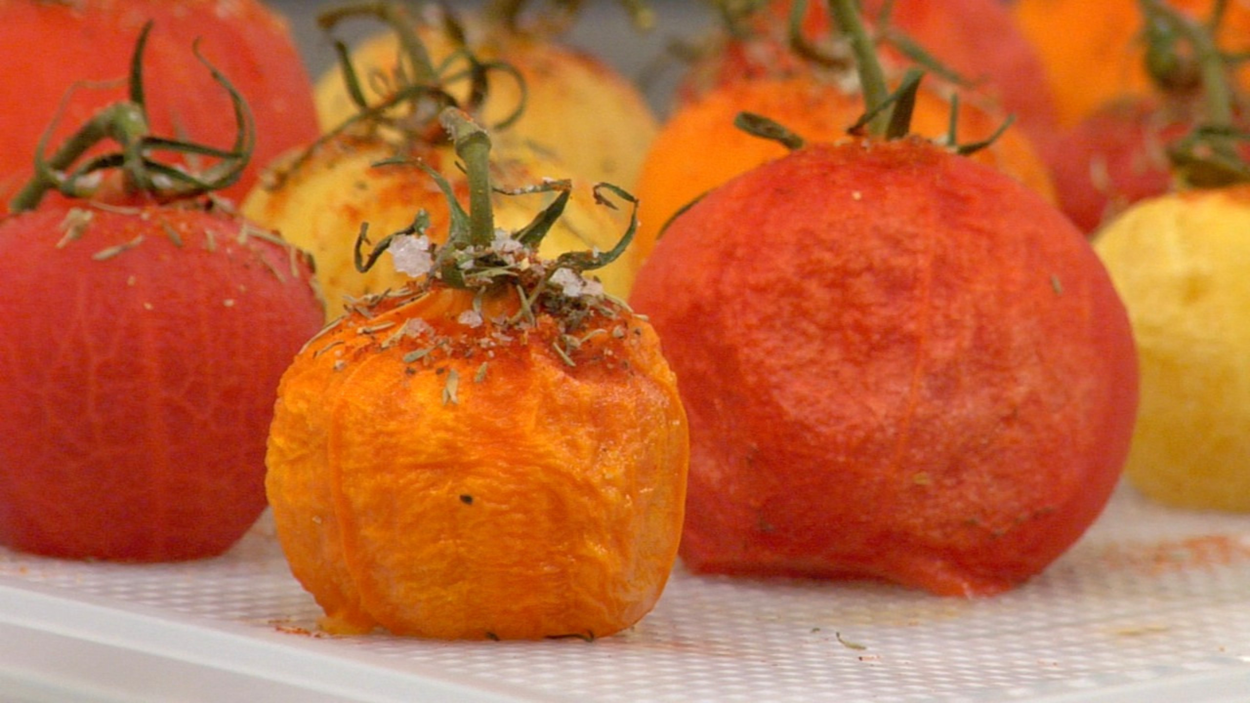 To prepare the semi–dried tomatoes, place the blanched tomatoes on a dehydrator sheet and sprinkle with all the spices. Place in dehydrator on 115 to 120°F (45 to 50°C) and dry for 6 hours.