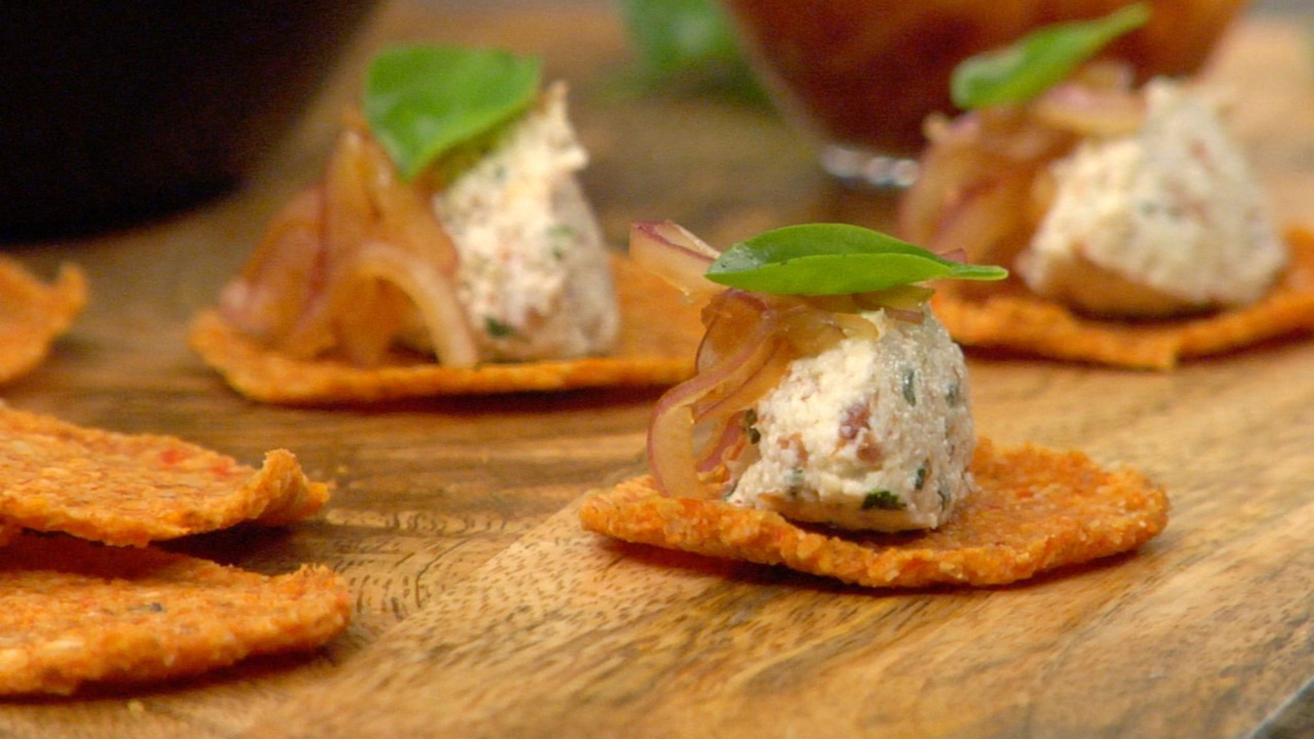 To assemble the canapés, first lay out your Sweet Pepper Crisps on a plate or serving tray.