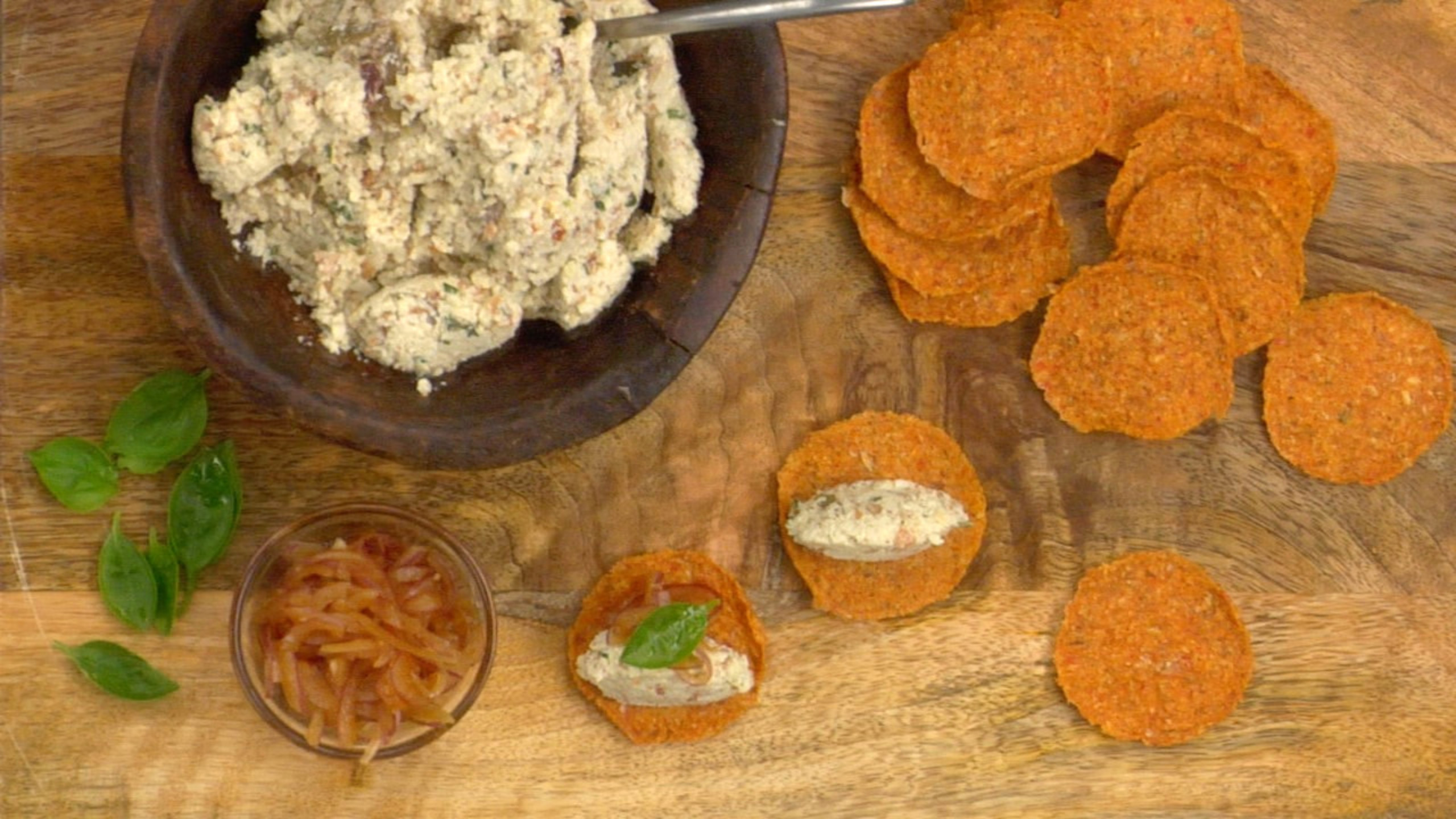 Using 2 small spoons, make a small quenelle of Almond Herb Pate on each cracker.