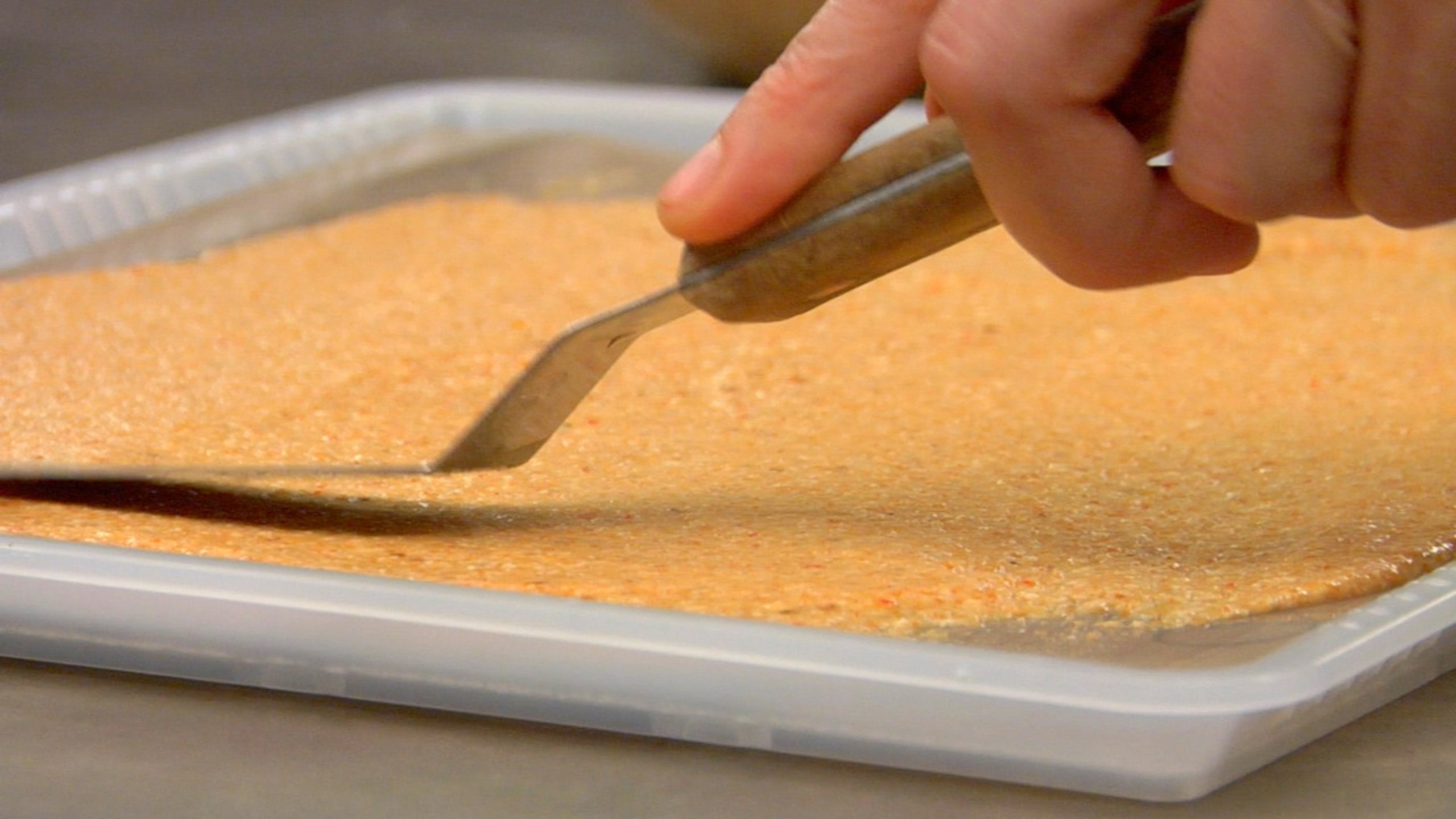 Using a non–stick dehydrator sheet and an offset spatula, spread the mixture evenly, less than 1/4–inch thick.