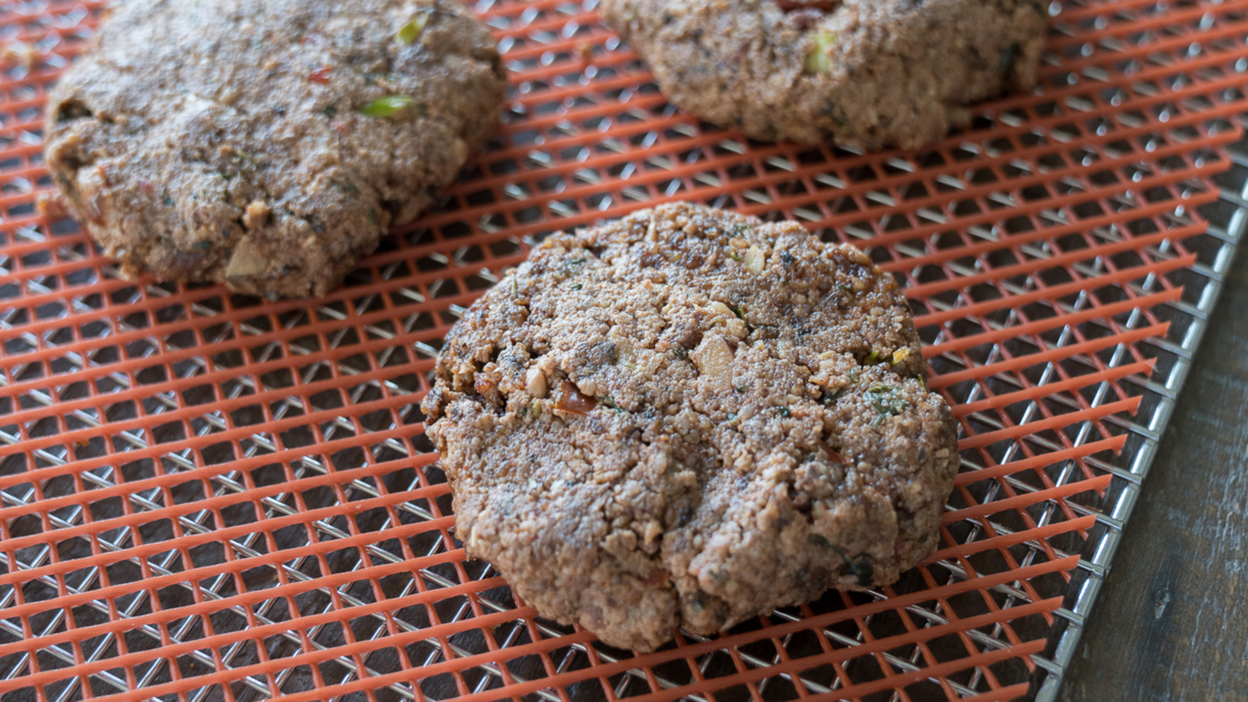 To dehydrate the burgers, on a dehydrator sheets, form the mixture into 1/2-dollar size patties and dehydrate at 115°F (45°C) for 4 to 6 hours.