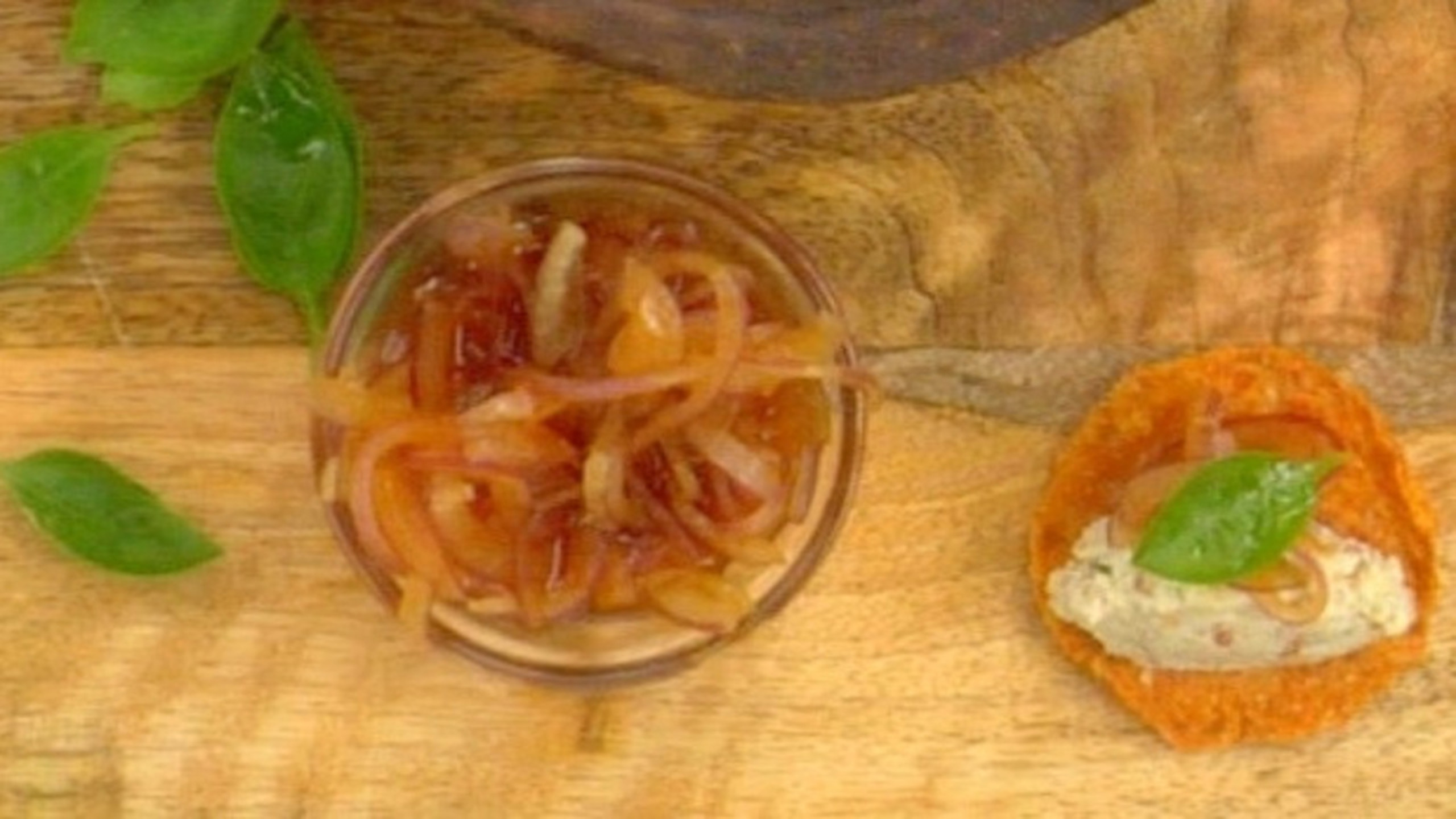 To prepare the condiment, using a mandolin, slice the onions or shallots paper–thin.