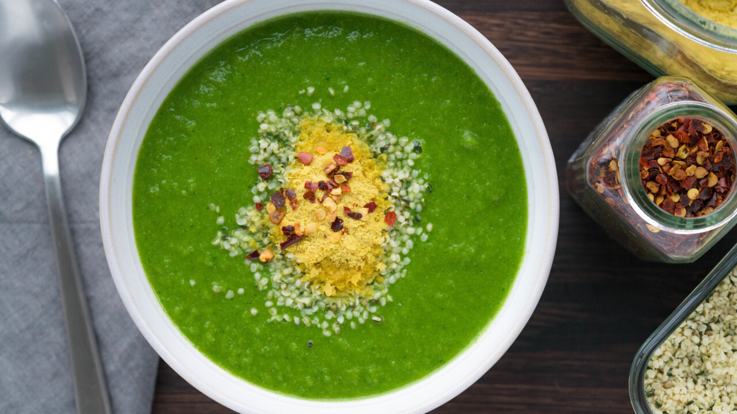 Lastly, taste for seasoning. Serve the soup either warm, room temperature or cold. If desired, serve the soup with a tablespoon some hemp seeds, additional nutritional yeast, and chili flakes.