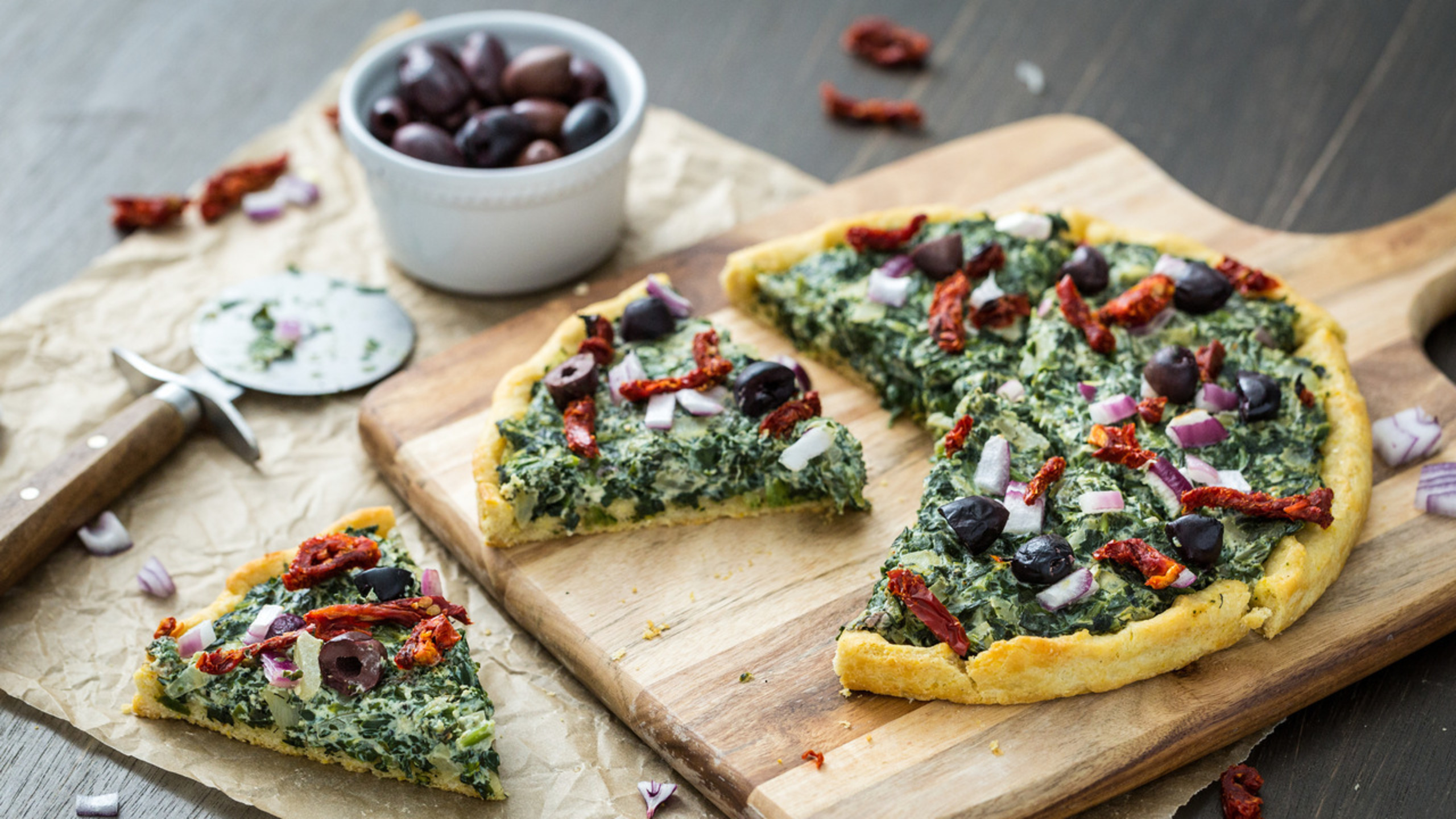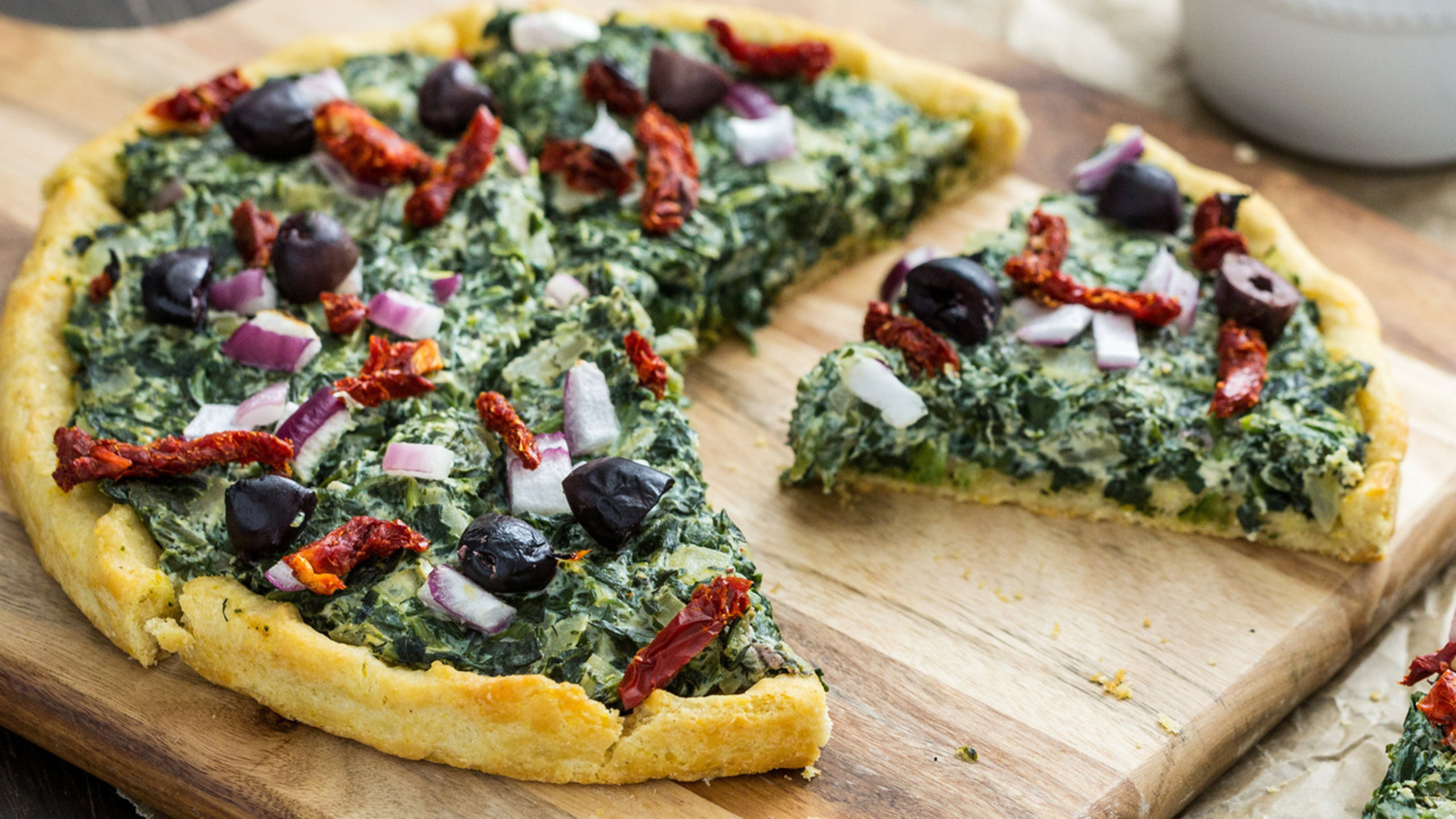 Place the pizza crusts on pizza stones or large baking sheets. Divide the spinach mixture evenly between the crusts and spread it to cover the crusts evenly. Top with the chopped sun-dried tomatoes, red onion, and olives.