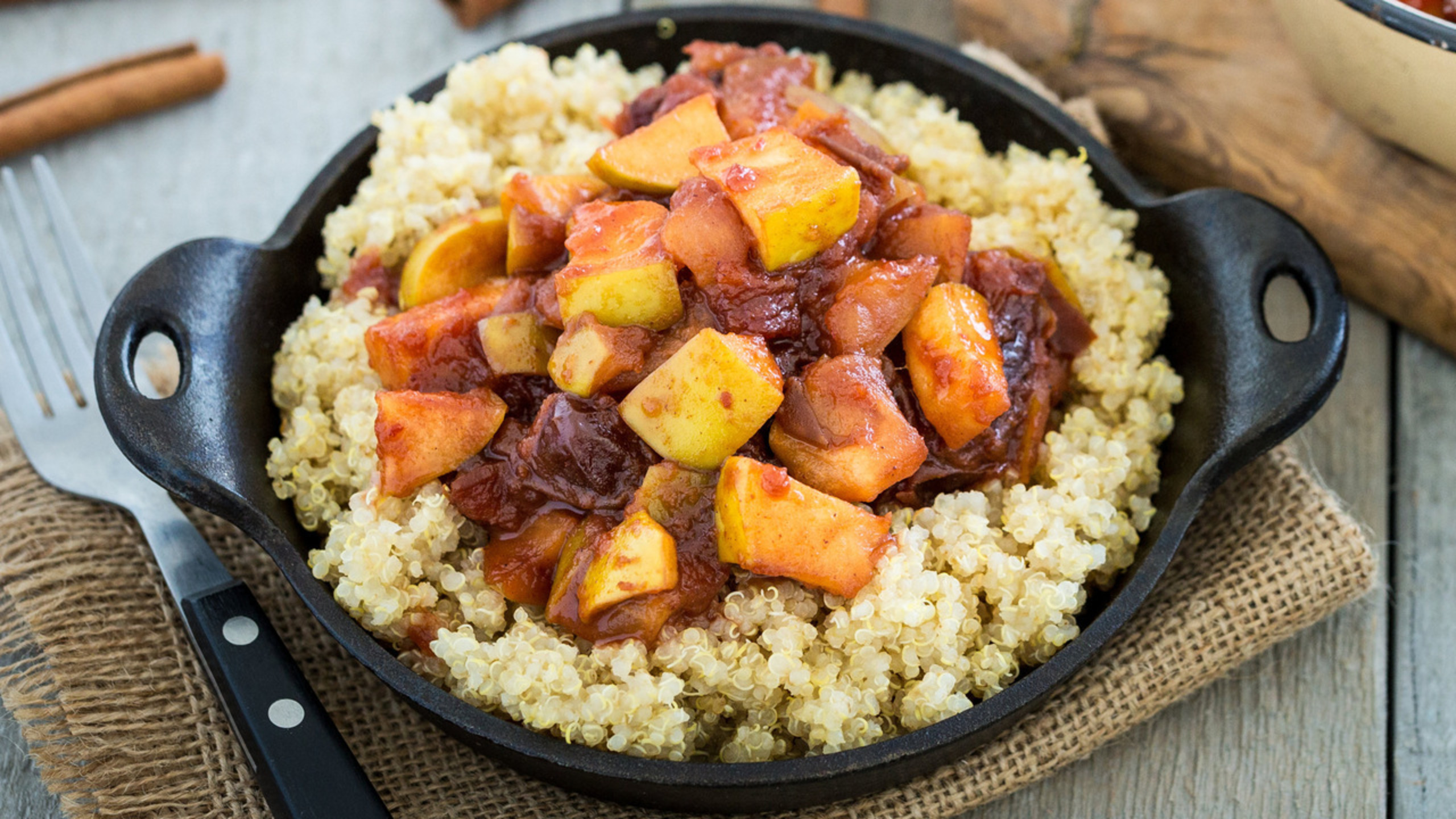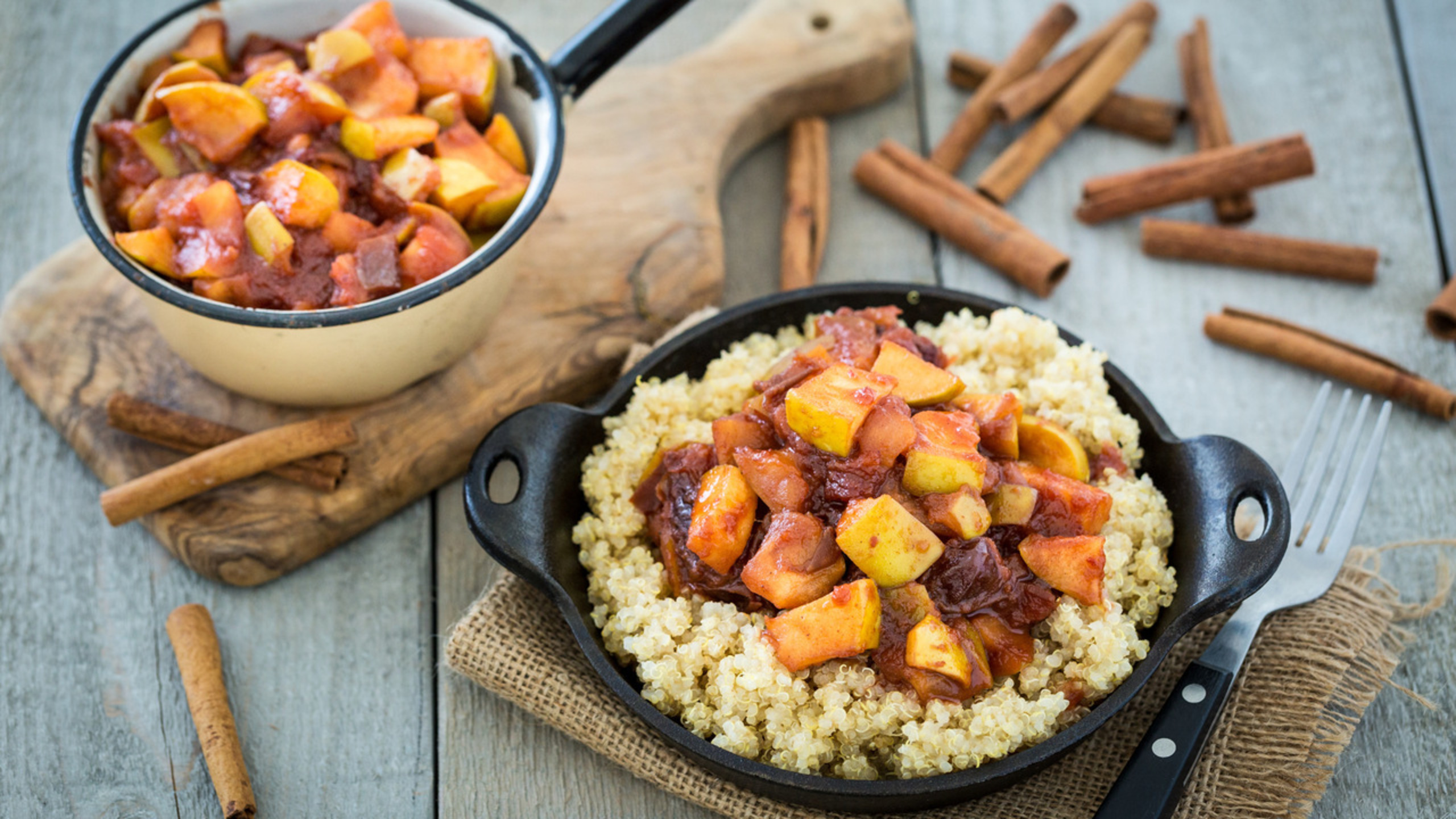 To serve, divide the quinoa among 4 individual bowls and top with the apple compote.