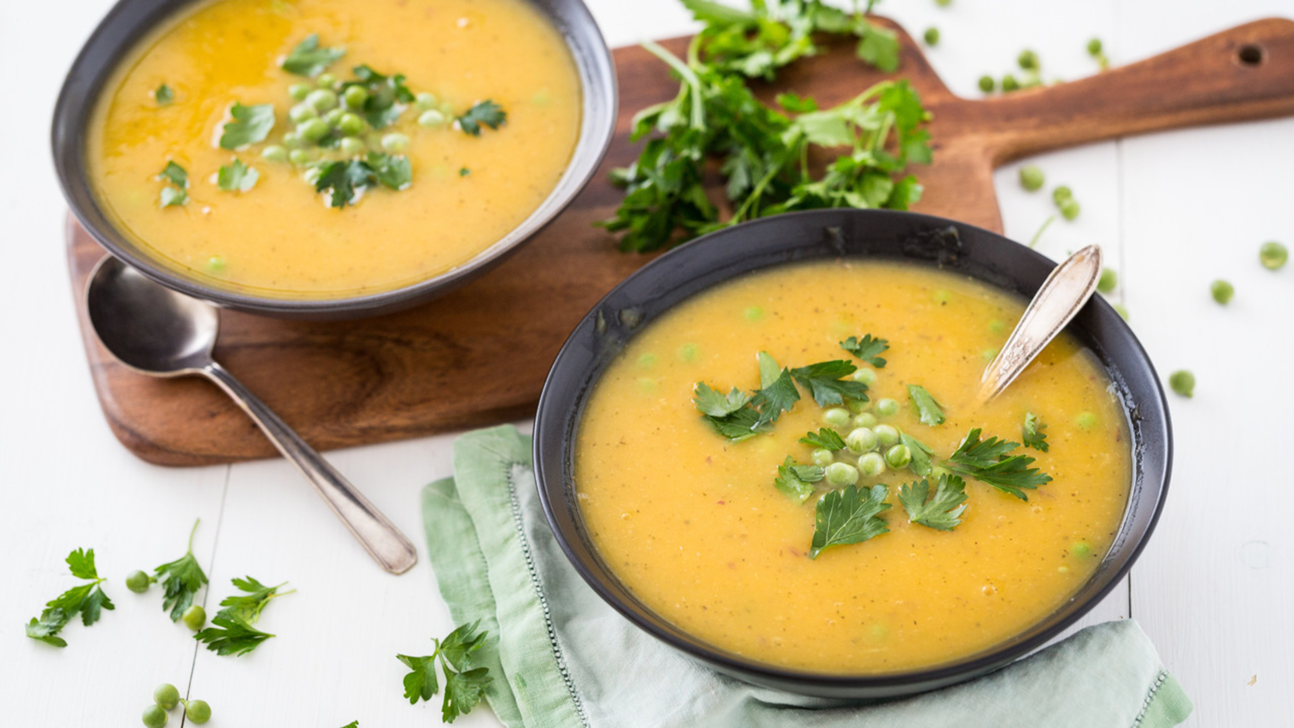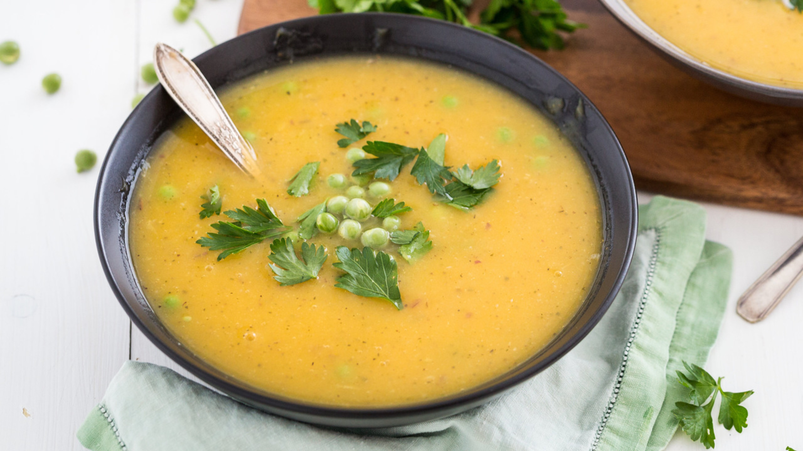Puree the soup using an immersion blender or transfer to a blender with a tight-fitting lid, covered with a towel. Return the soup to the pot and add the green peas and lime juice. Cook for an additional 5 to 7 minutes, or until the peas are tender. Serve hot, garnished with the parsley.