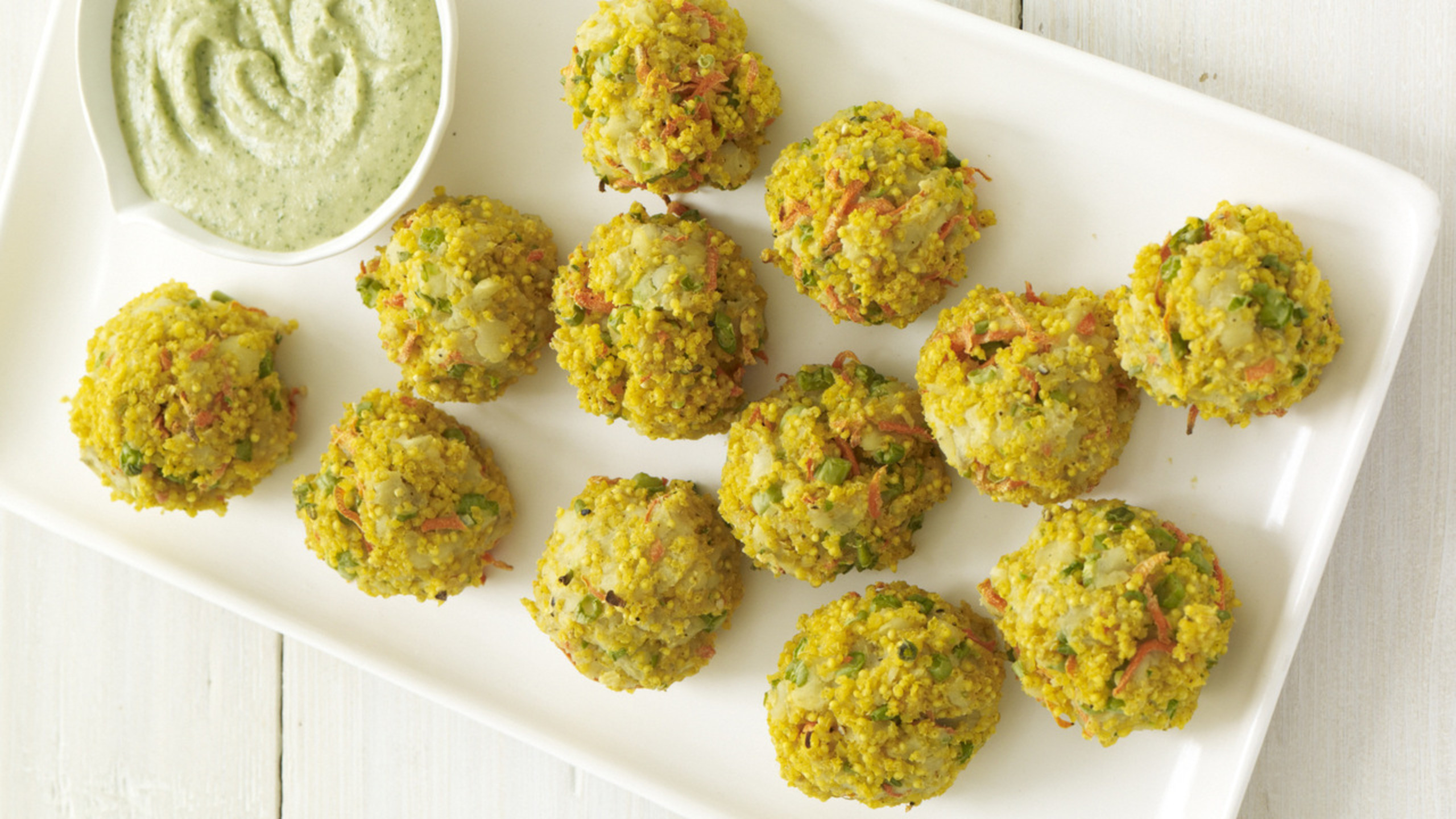 Line two baking sheets with parchment paper and using an ice cream scoop, place roughly 1/2-cup scoops of the millet mixture on the baking sheets, making sure they do not touch each other. You should have about 2 dozen croquettes.Bake until the croquettes are lightly browned and crusty on the sides and bottom, about 30 minutes. Gently turn the croquettes over and continue to bake until nicely browned and crusty all around, about 30 minutes more; do not undercook or the croquettes will be crumbly. Serve hot, with the dipping sauce alongside.
