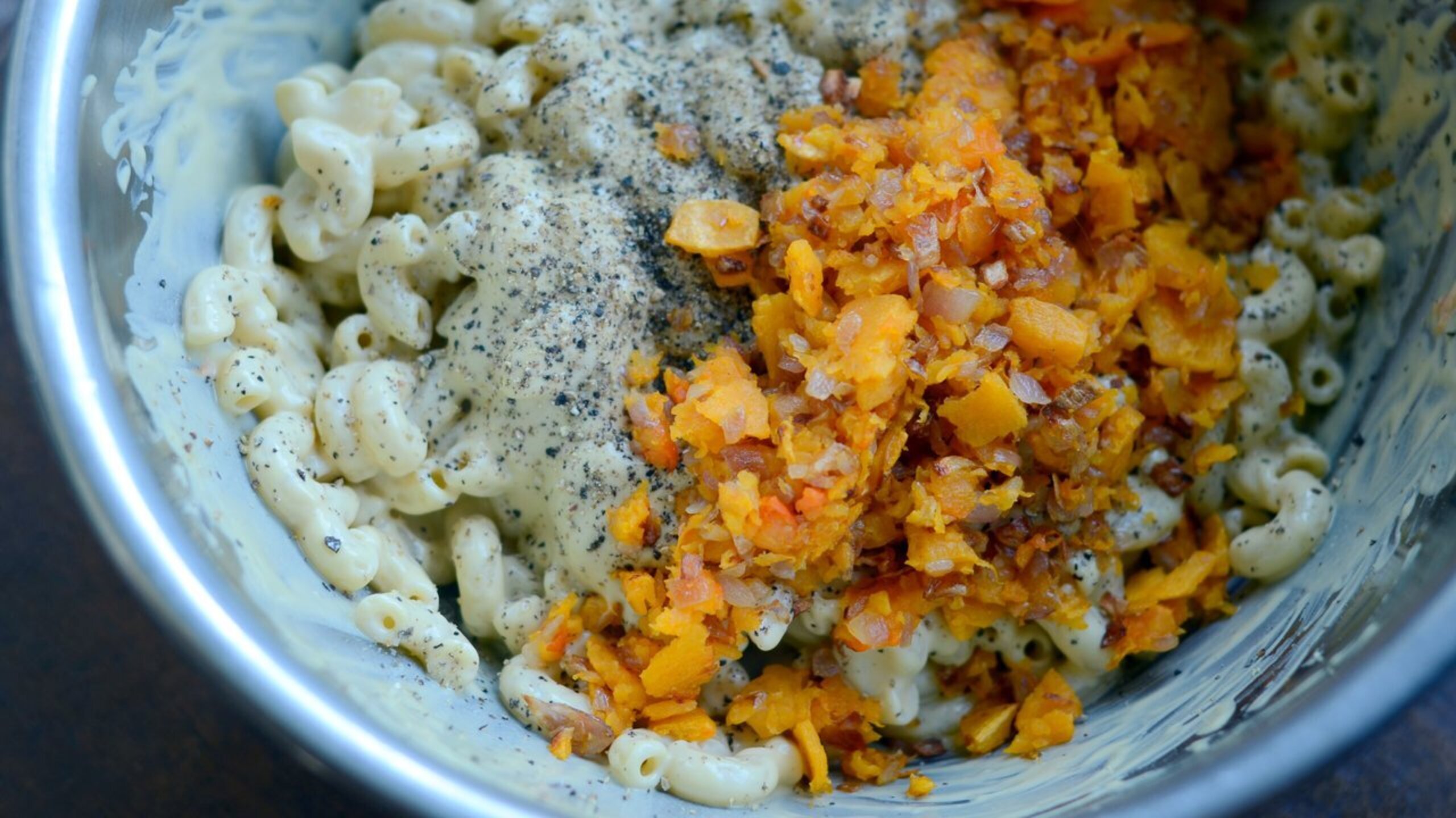 At this point, add the pasta to a large bowl and pour in the cheeze sauce. Add the onion and squash and gently stir to evenly distribute the ingredients. Taste for seasoning.
