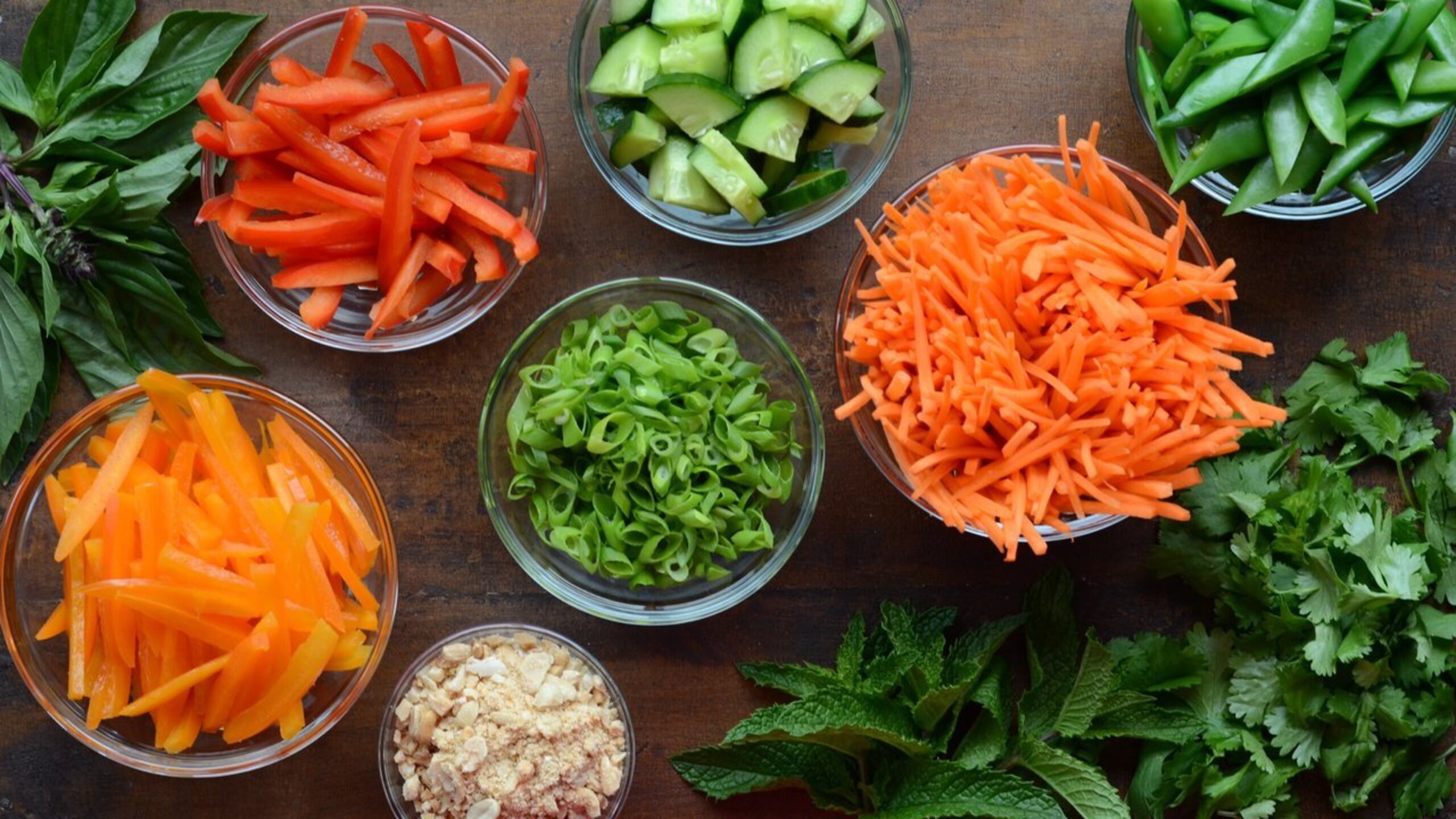 To assemble the salad, evenly divide the noodles, carrots, peppers, cucumber, snap peas — and lettuce, if using — between 4 bowls. Top each bowl with some of the green onions, herbs, sprouts (if using) and garnish with some of the peanuts. Lastly, ladle some of the dressing over each bowl and serve immediately.