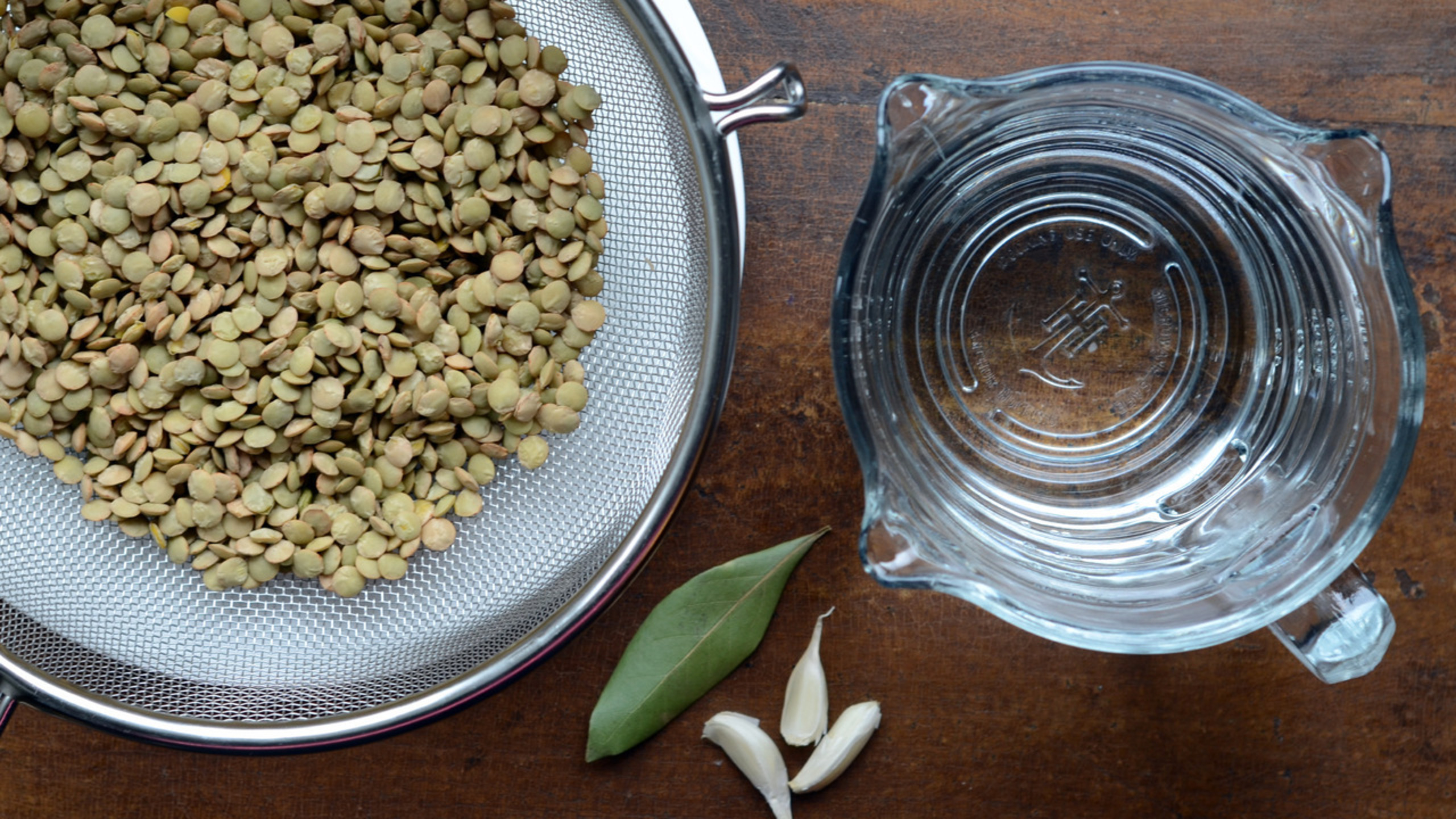 Next, combine together the lentils, water, bay leaf and garlic. Reserve the salt for later, once the lentils have finished cooking (salt or other acidic ingredients are often added at the end, as they can sometimes cause the lentils to stay a bit crunchy even when fully cooked).