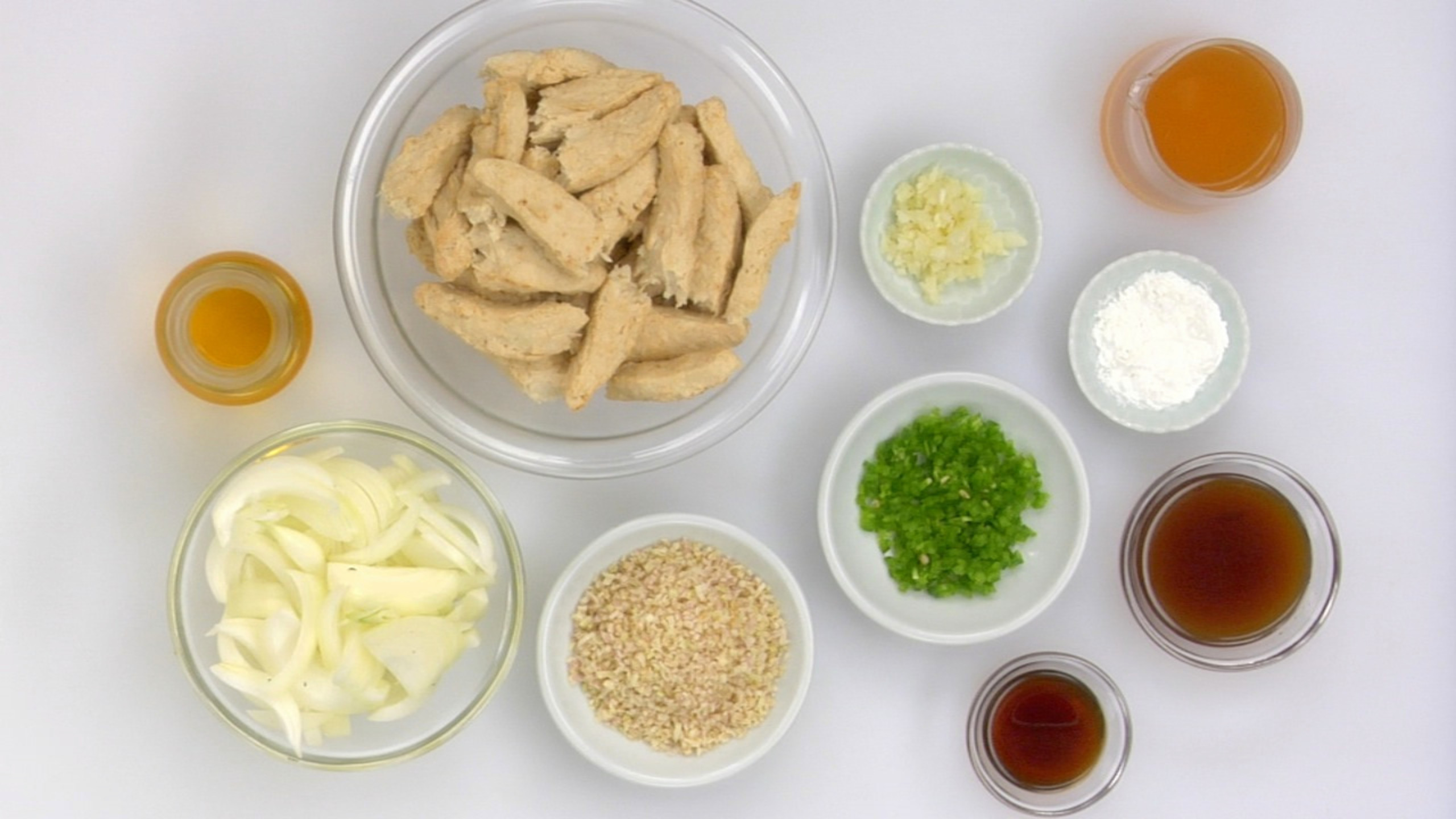 To make this stir-fry, first gather and prepare your mise en place. To cook the dish, heat a wok over high heat. Once hot, add the oil, followed by the Chick’n Strips — you may need to cook the chick’n in 2 batches. Toss and continue to cook the chick’n until it has nicely browned on all sides. Remove the strips and set aside.