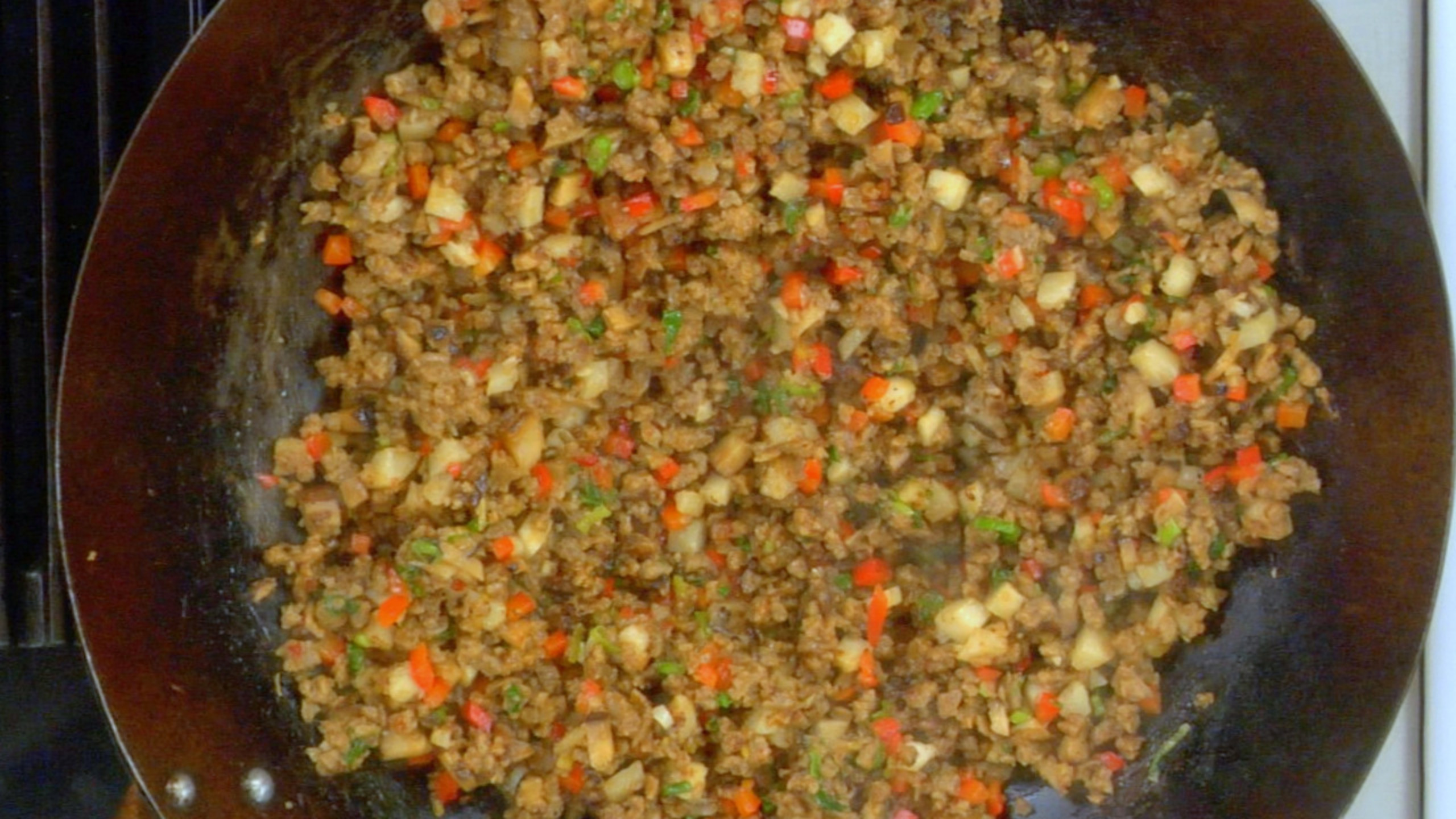 Add the diced shiitake and Beefless Crumble and break up any big clumps. Cook until lightly browned, about 4 to 6 minutes.