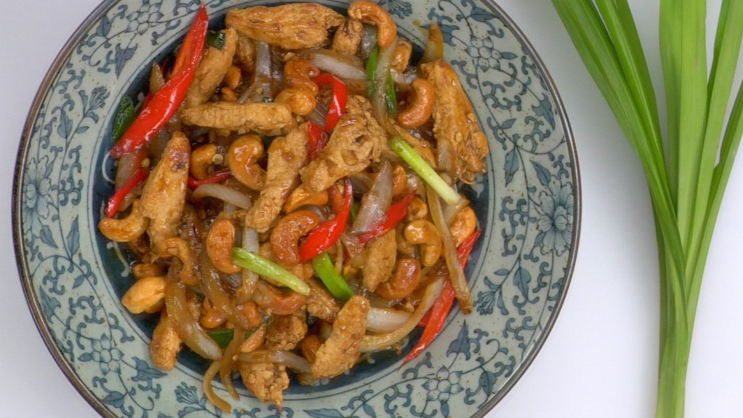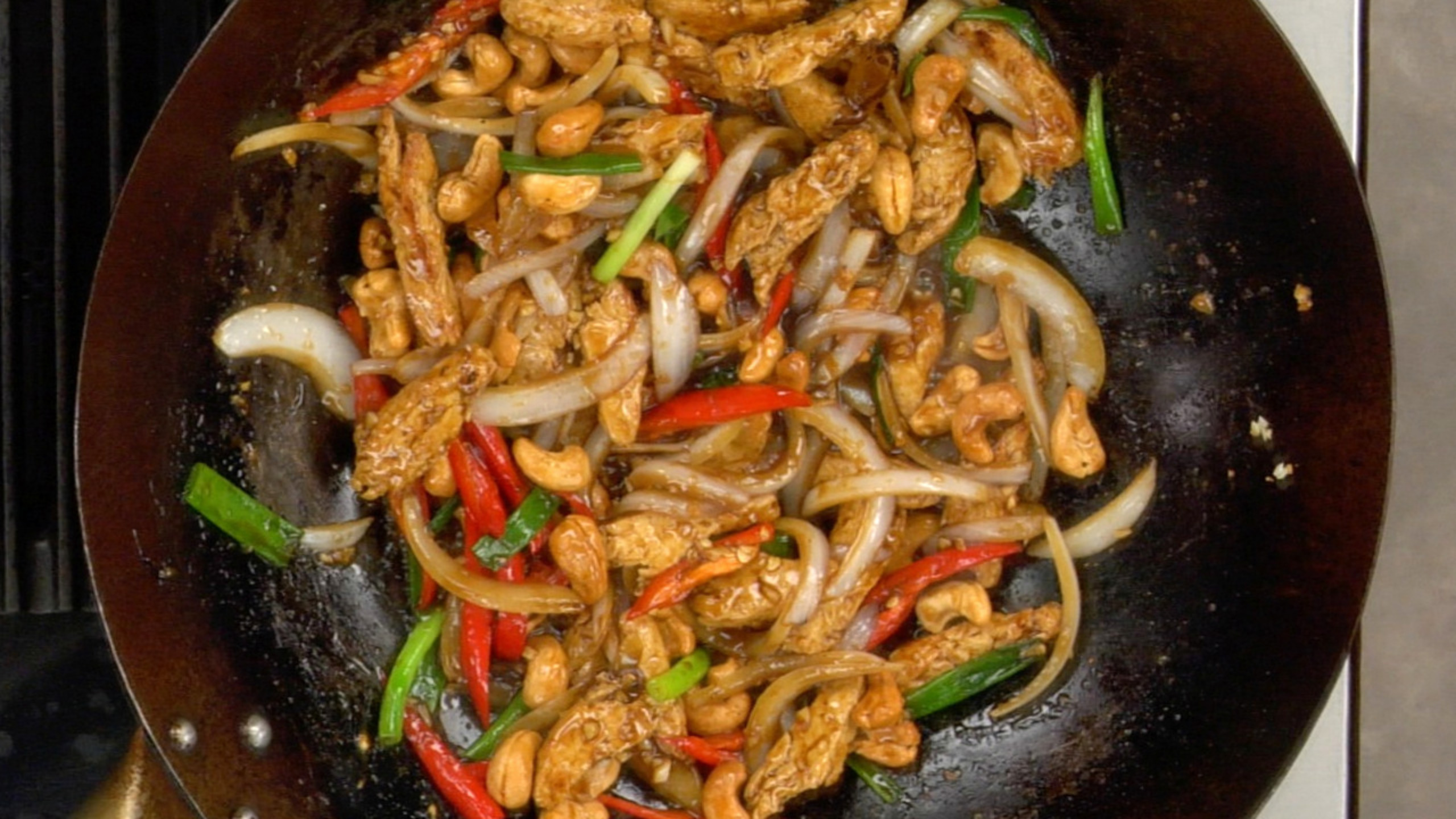 To cook the dish, heat a wok or large fry pan over medium-high heat. Once hot, add the oil and sauté the Chick’n until it is cooked halfway through. Add the garlic and sauté for about 30 seconds, followed by the onions and salt and continue to sauté for another minute or so. Add the chilies and cook for 2 minutes before adding the green onions and sauce. Toss to coat.