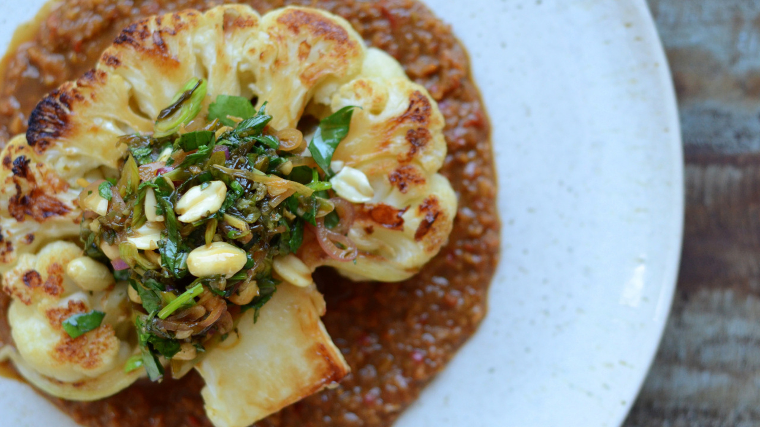 To finish the dish, place a spoonful of peanut sauce onto the a plate and spread out to form a round. Place a cauliflower ‘steak’ into the middle. Top with the warm sauce and serve immediately.