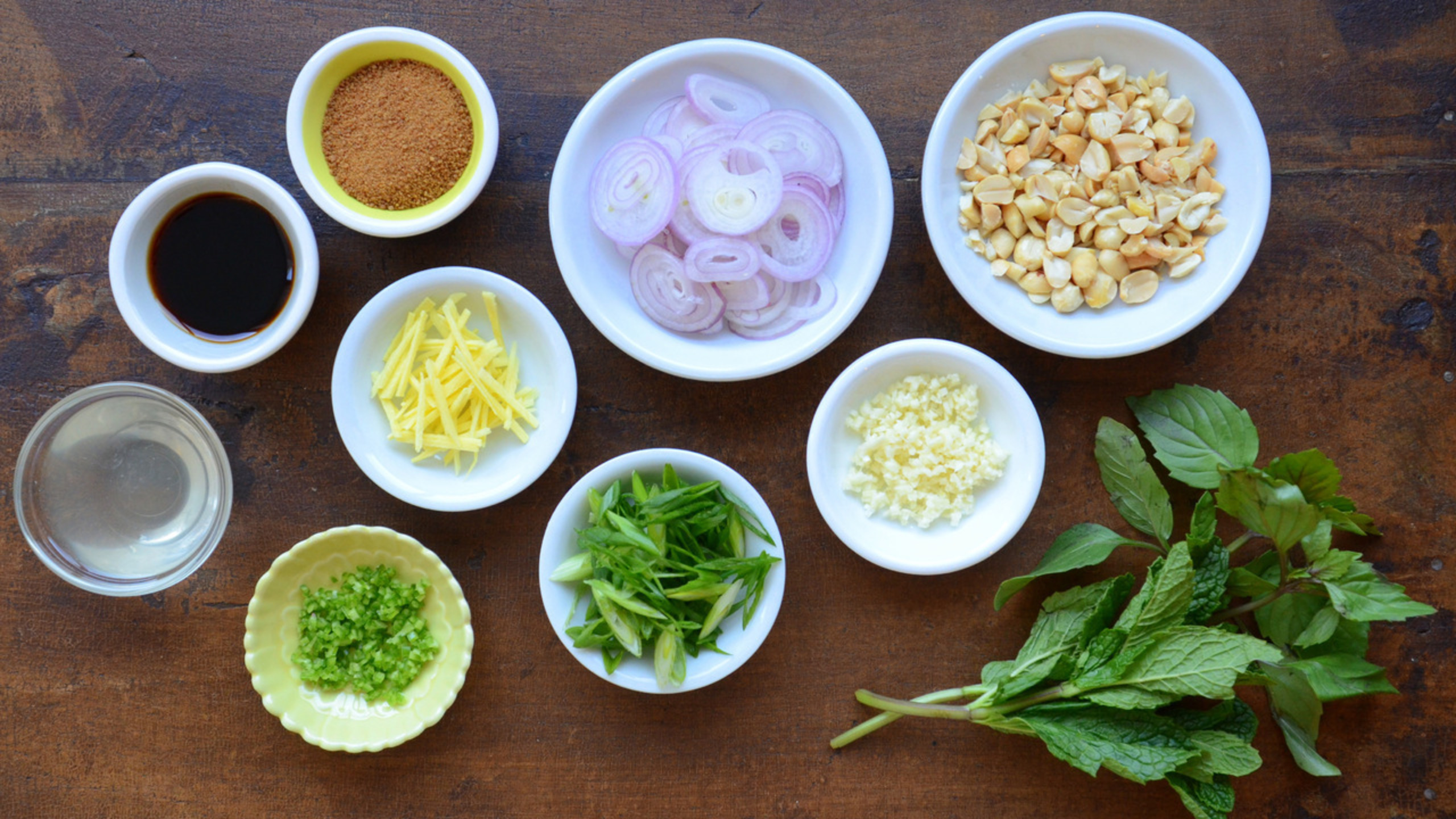 - 1/3 cup mint, Thai basil and cilantro, roughly chopped