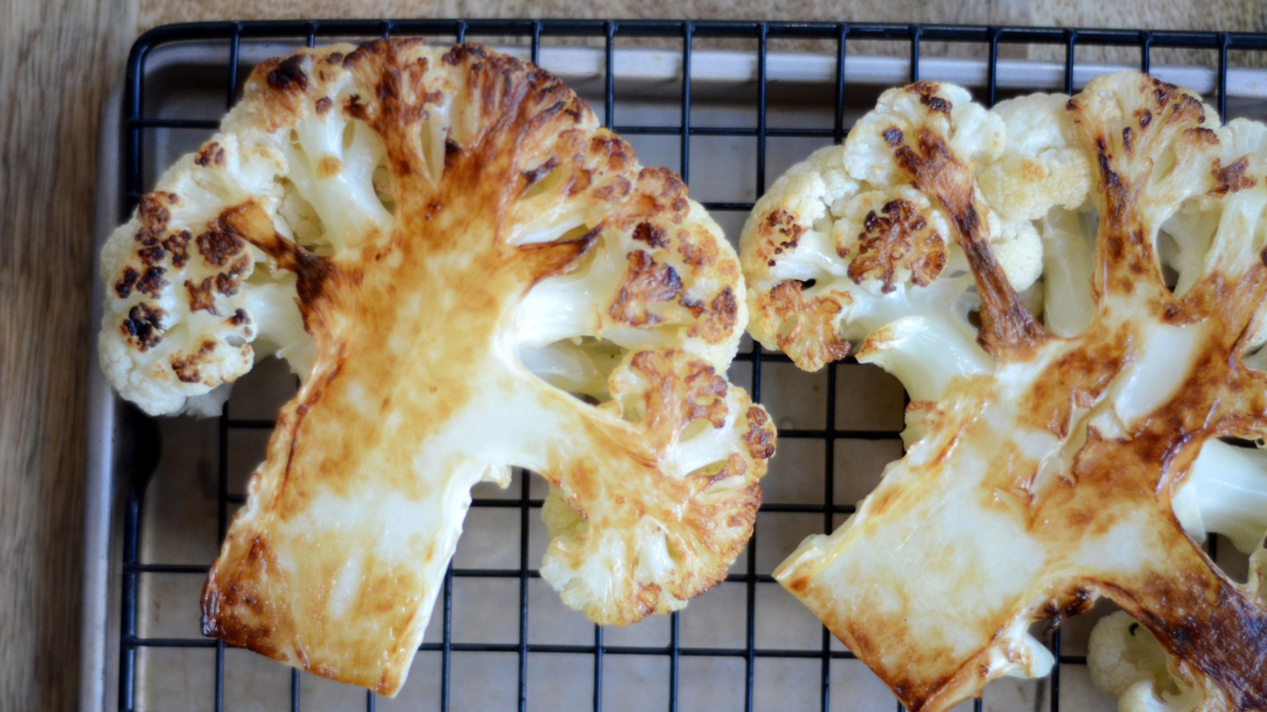 Next, heat a large fry pan—or better yet, a cast iron skillet—over medium heat. Once hot, add the oil, followed by the cauliflower. Let the cauliflower cook for about 4 to 6 minutes, or until golden brown on each side. Try not to fiddle with the pieces too much, otherwise the ‘steaks’ will start to fall apart.