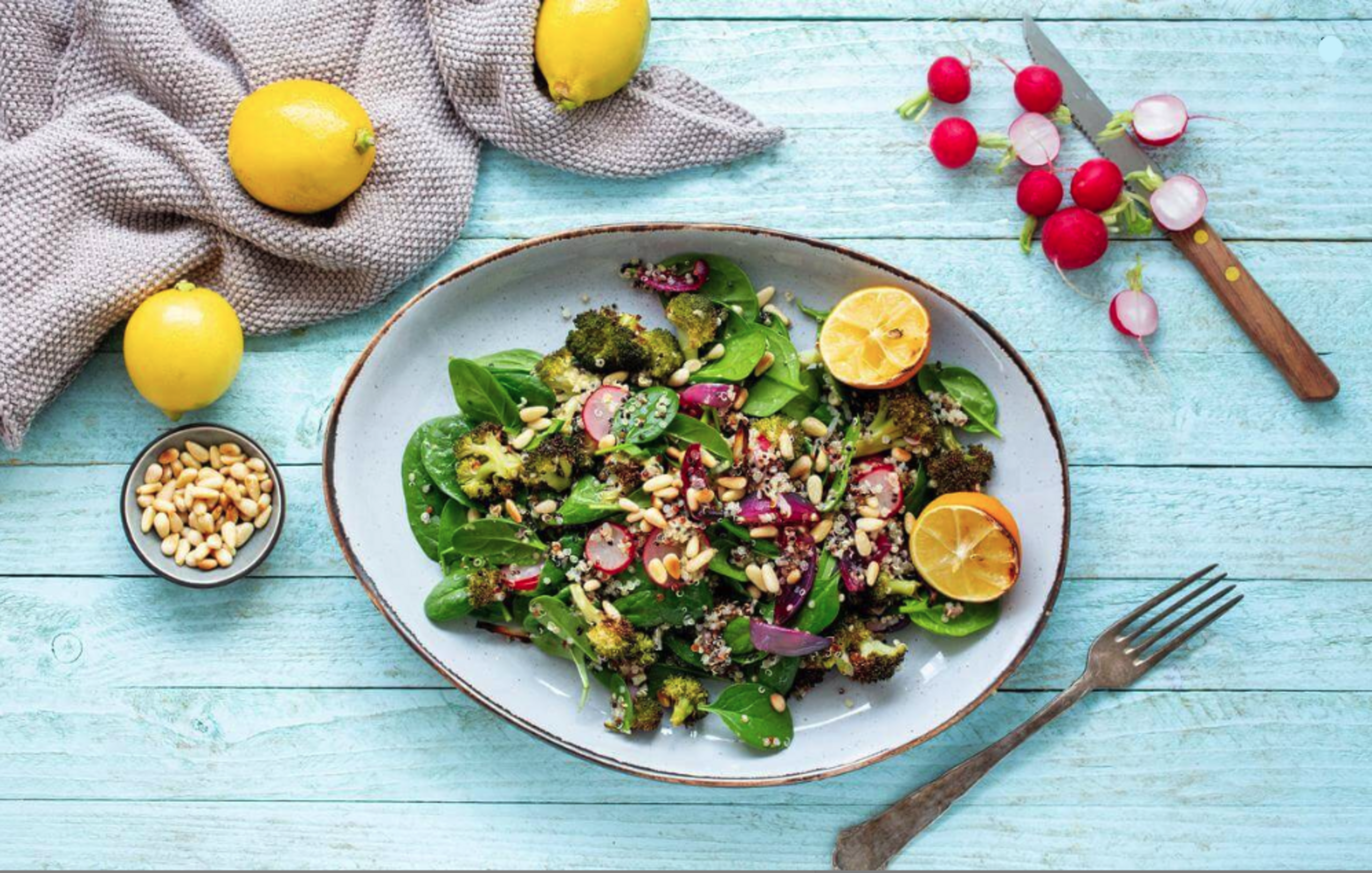 Add broccoli and red onions to salad, then drizzle with roasted lemon vinaigrette; toss to mix. Season with salt and pepper to taste. Serve salad with a sprinkle of toasted pine nuts and remaining roasted lemon.