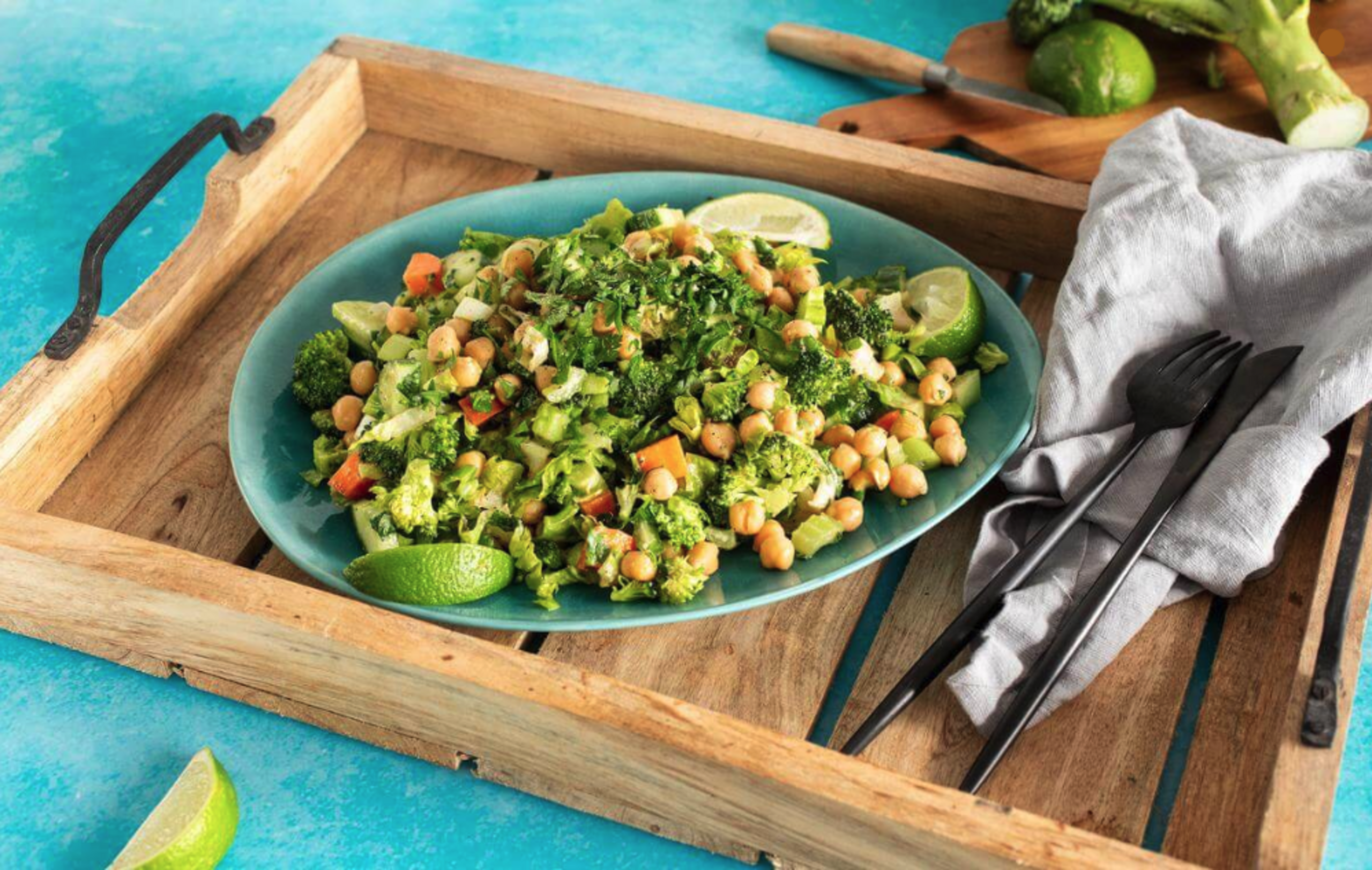 In a large bowl, toss chickpeas, romaine, broccoli, cucumber, carrots, celery, and scallions.