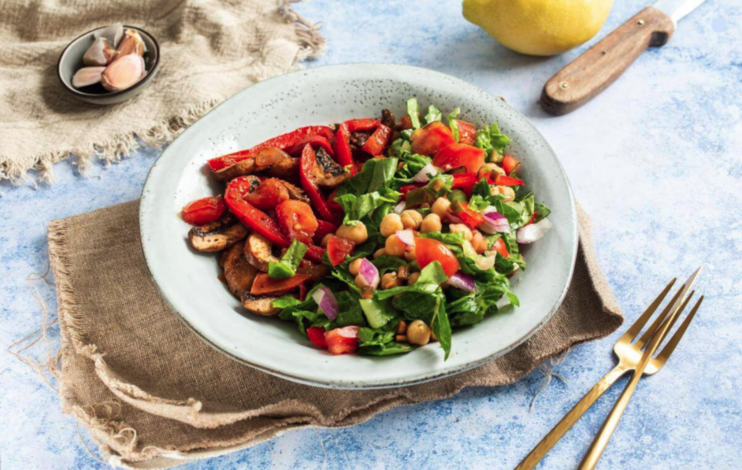 In a large bowl, combine chickpeas, 3⁄4 cup bell peppers, 1⁄3 cup red onions, 2 1⁄4 cups tomatoes, and 1 1⁄2 teaspoons garlic along with jalapeño, lemon juice, aquafaba, and lettuce. Toss to combine. Season with salt and pepper to taste.