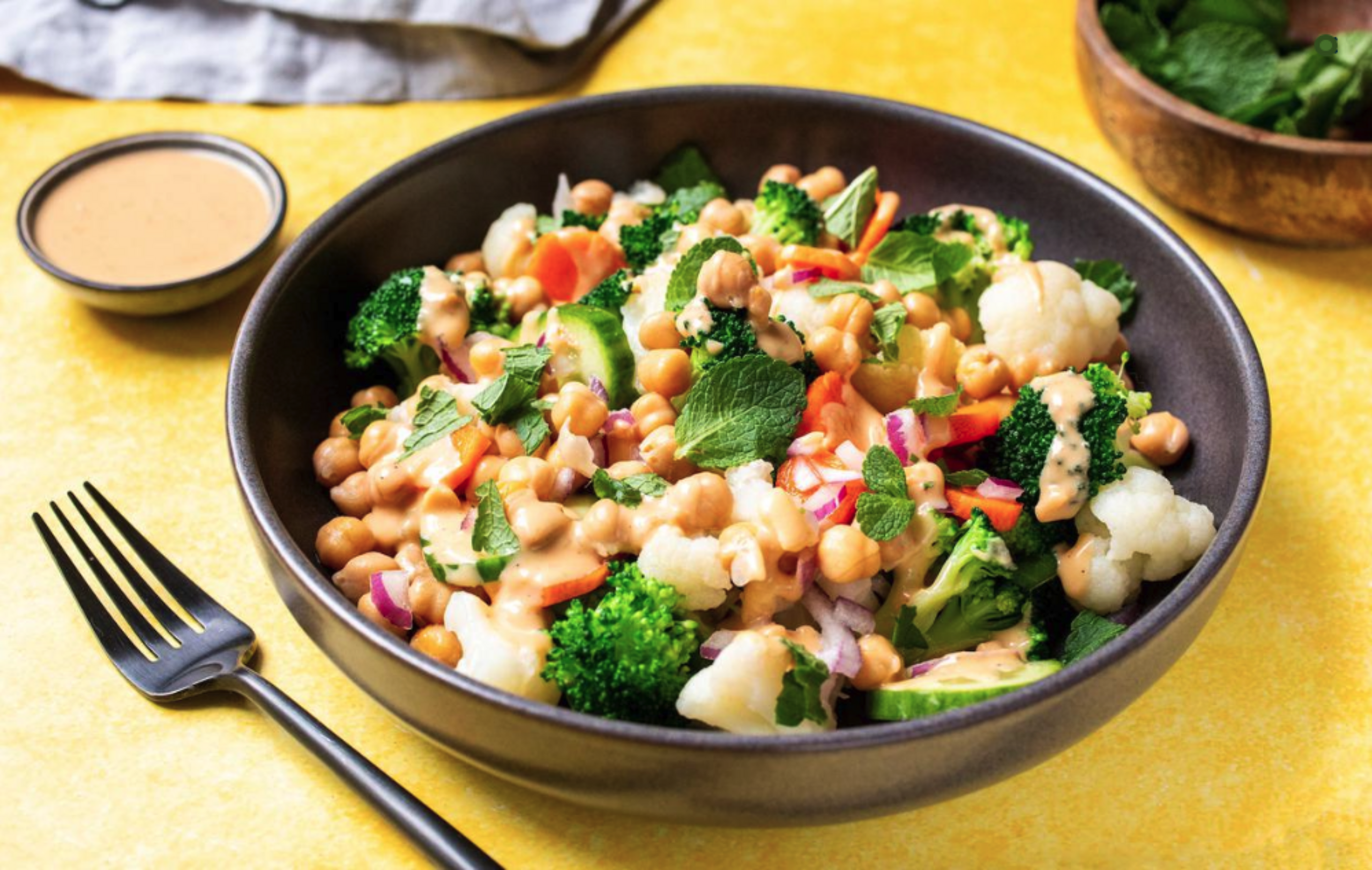 Add dressing to salad and toss to combine. Season with salt and pepper to taste. Garnish with fresh mint, if desired. Serve alongside sliced baguette.
