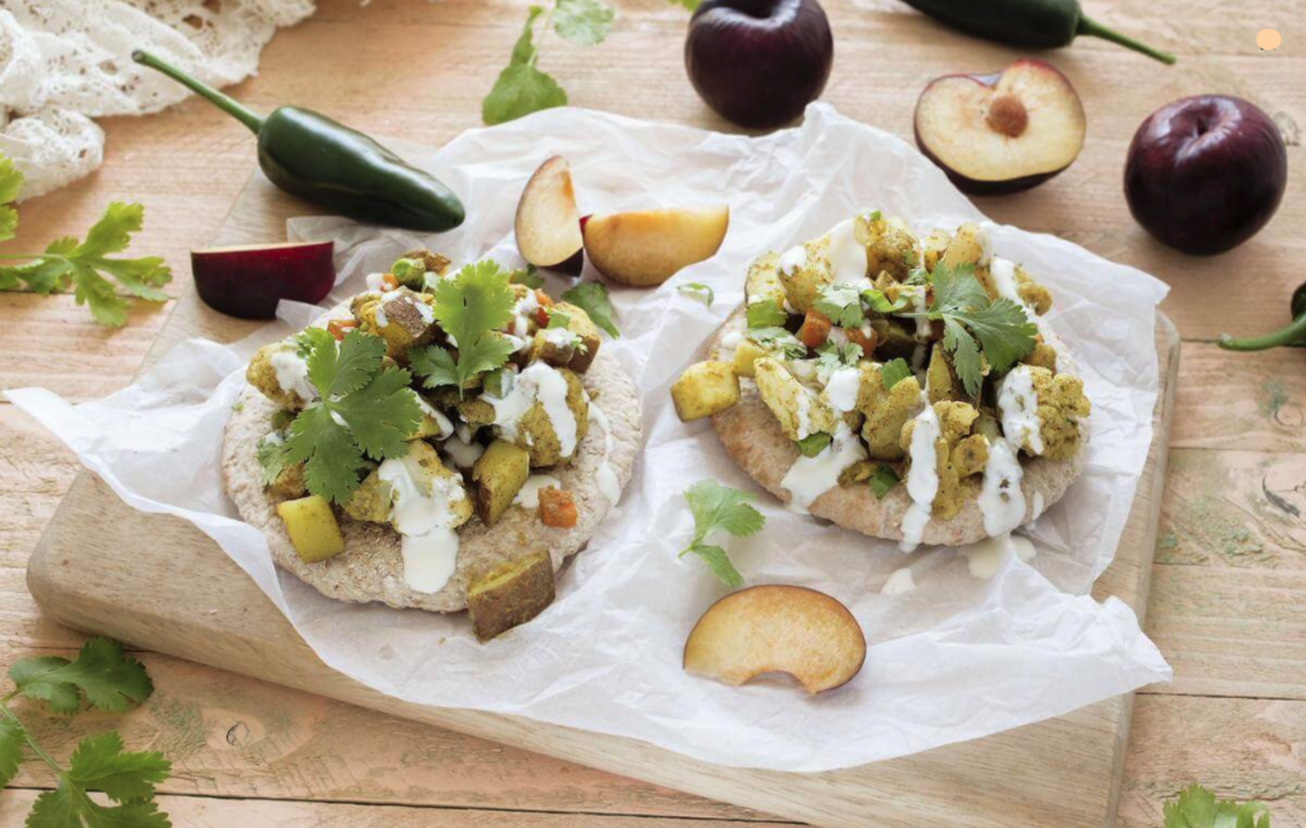 Spoon vegetables onto warmed pita breads. Drizzle with cashew cream and sprinkle with cilantro. Serve alongside plums.