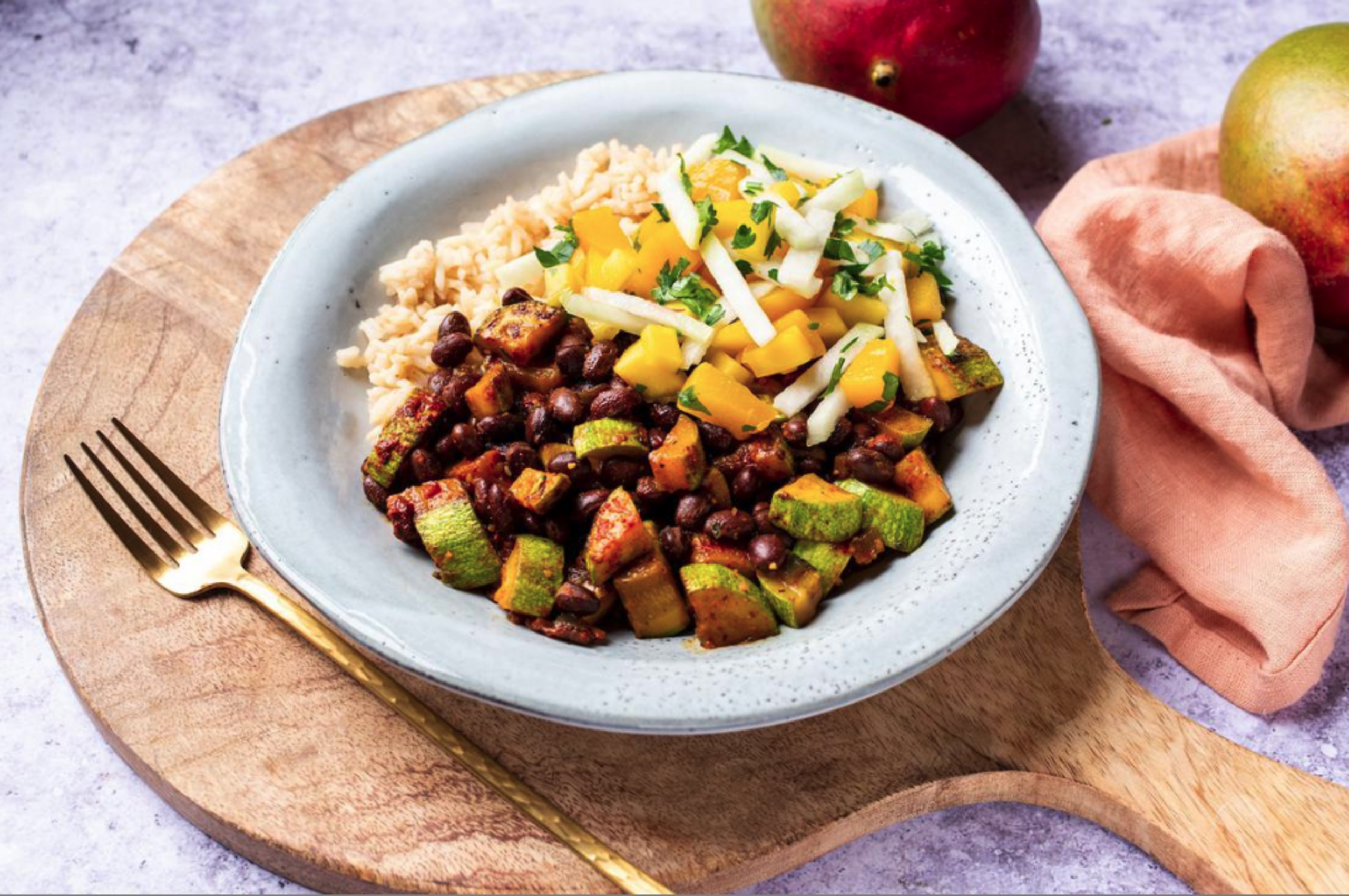 Serve beans over rice and top with mango-papaya salad.