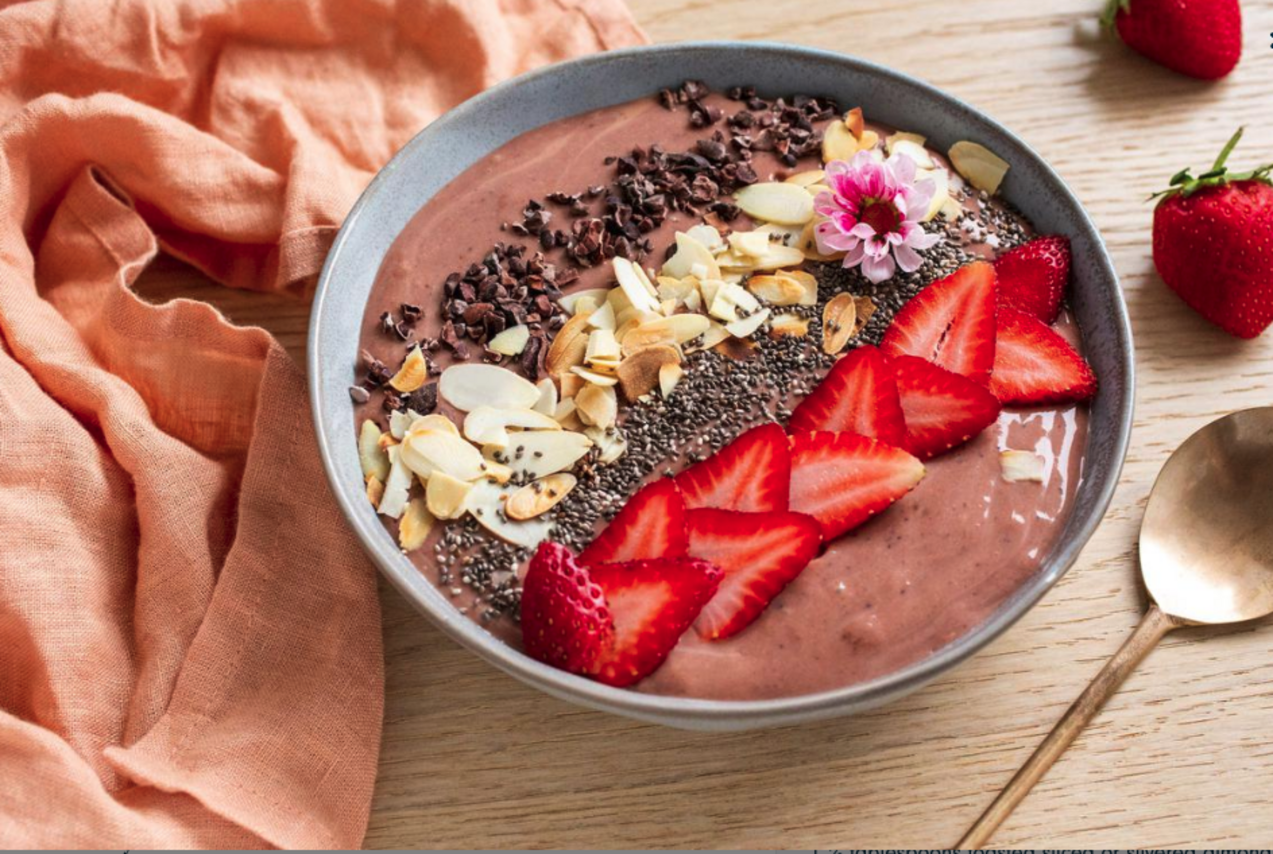 Transfer mixture into serving bowls. Top each bowl with remaining sliced strawberries, chia seeds, almonds, and cacao nibs.