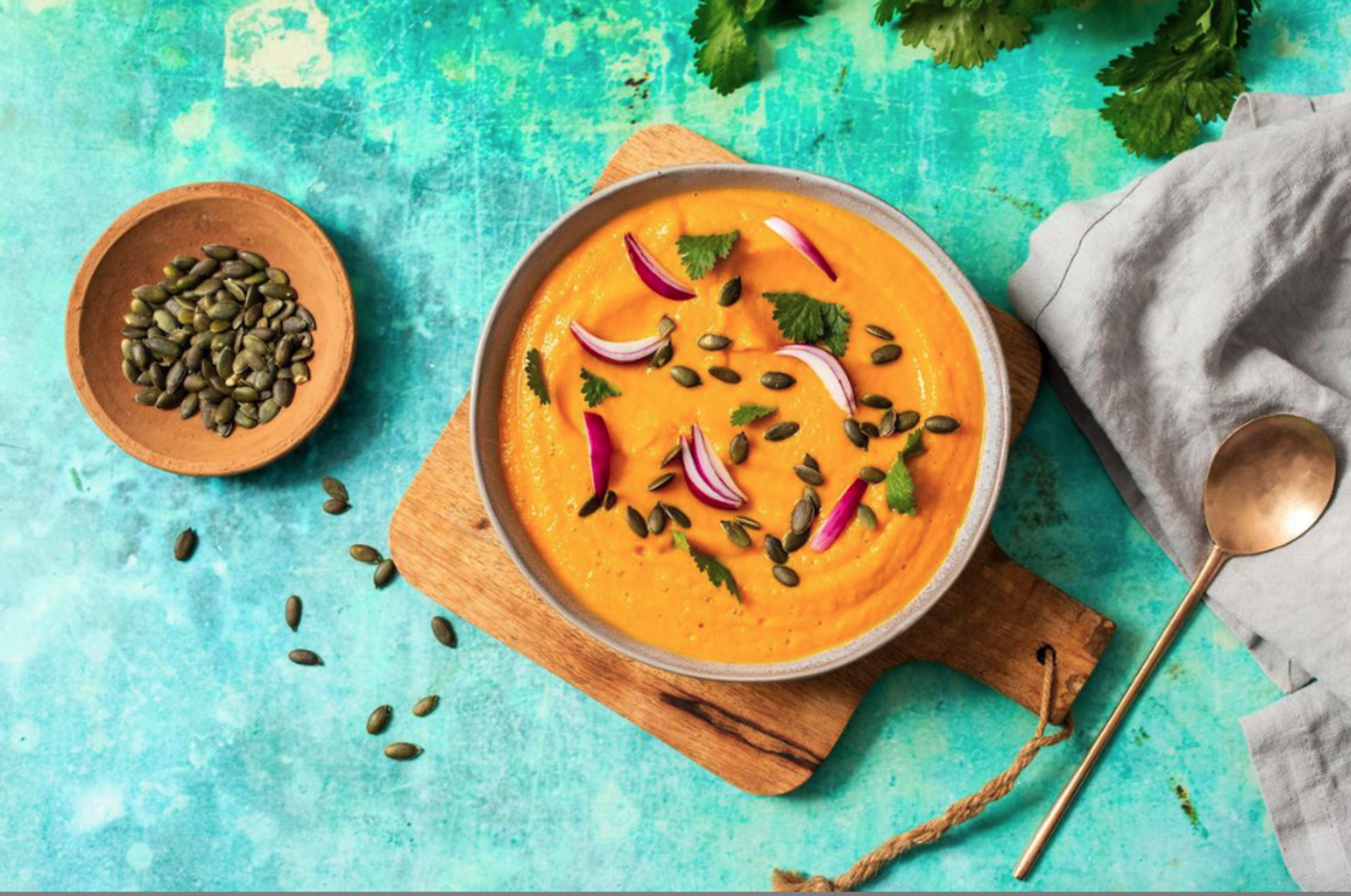 Serve warm. Top with roasted sunflower seeds, cilantro, and red onions.