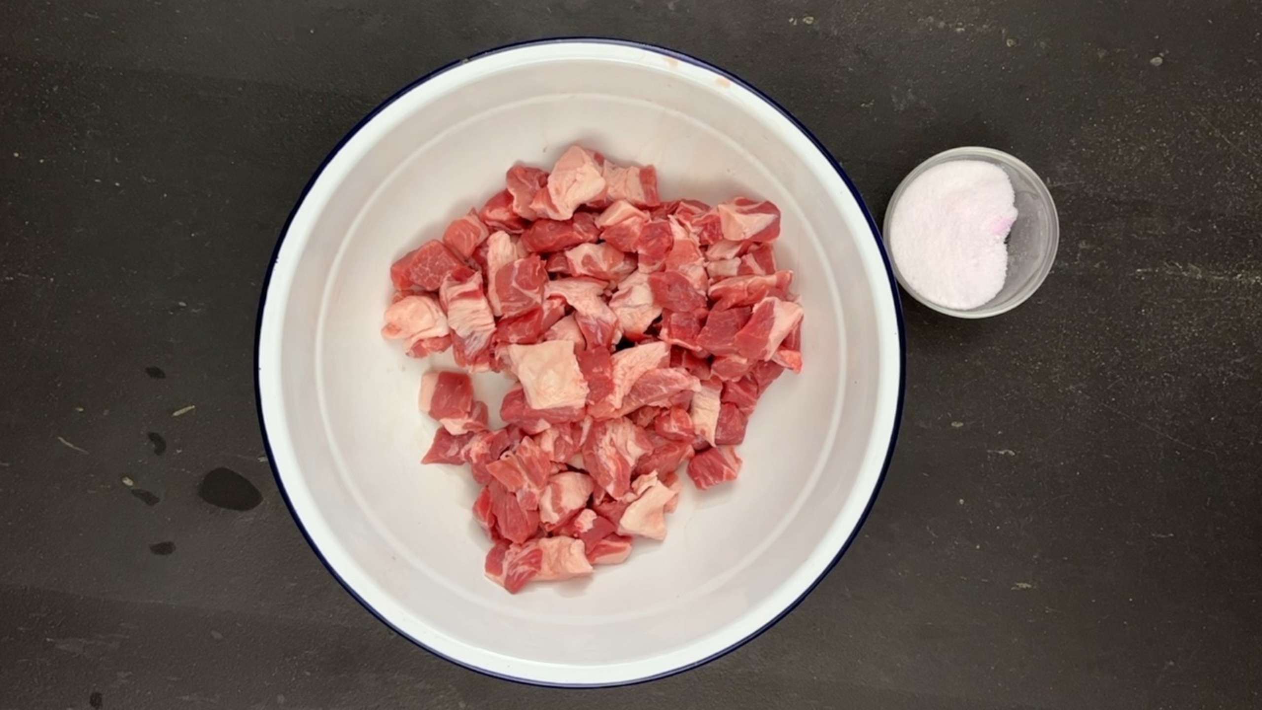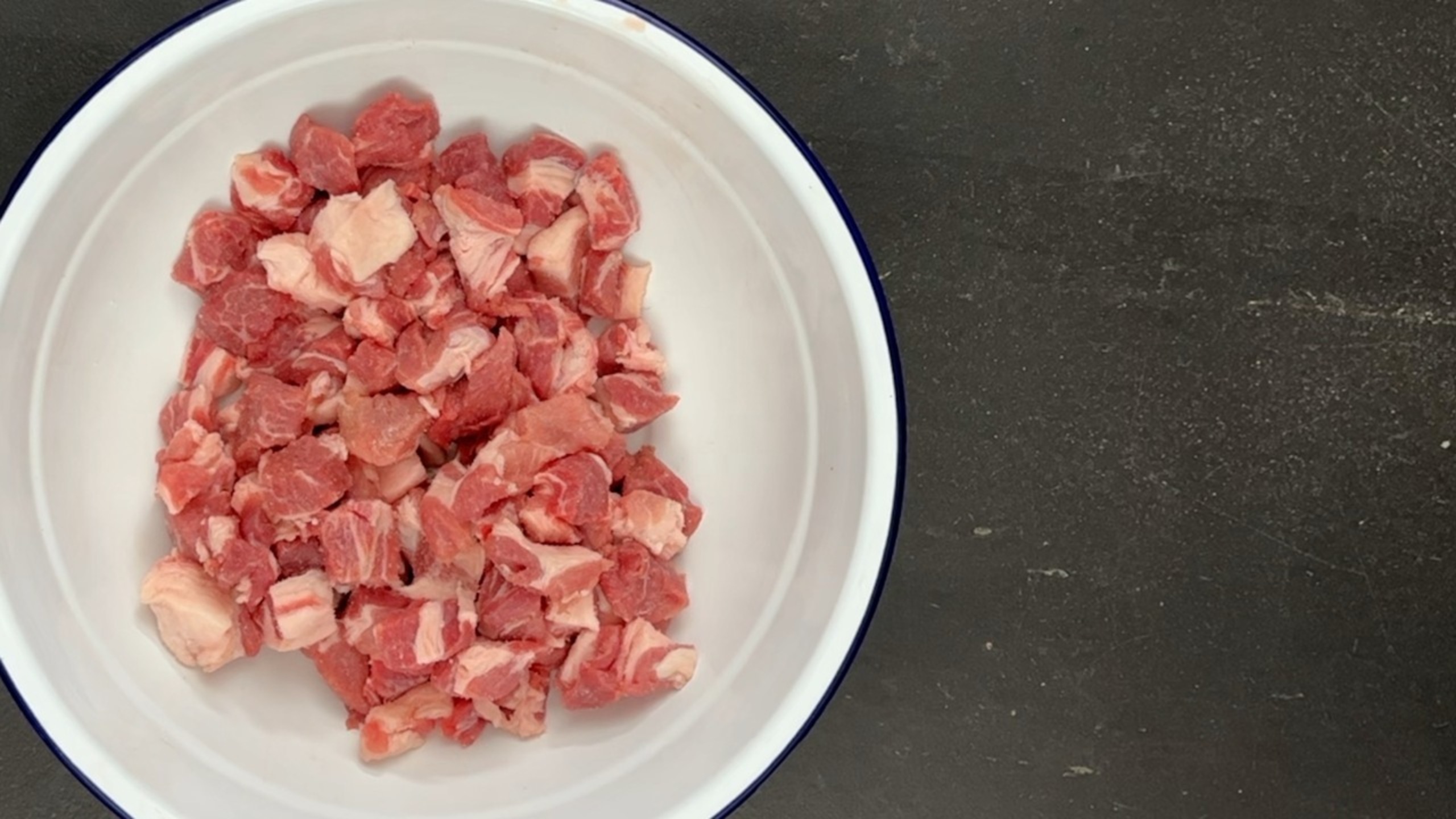 Cut the pork into cubes for grinding.