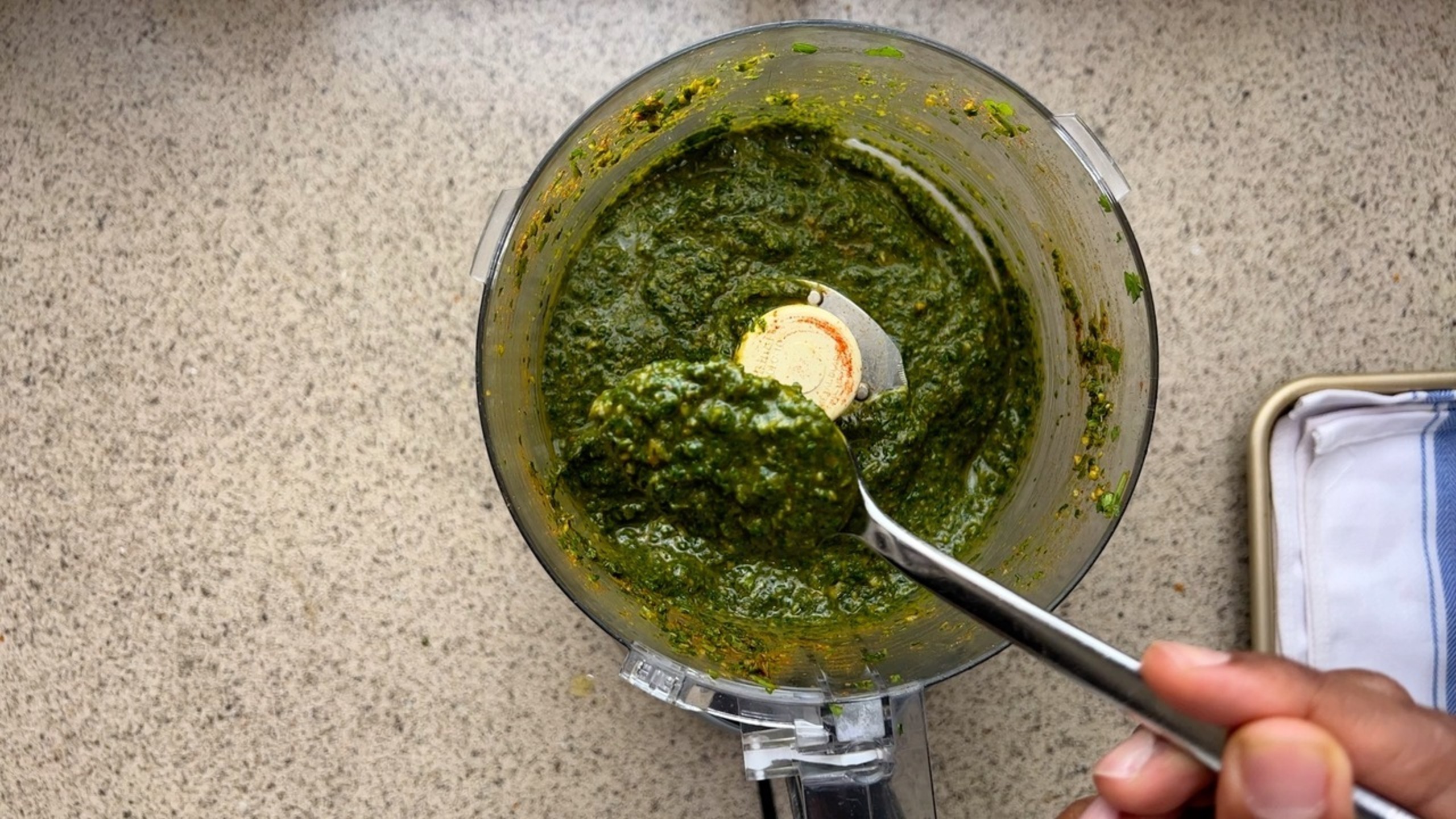 Add the herbs into a food processor, along with the spices, garlic, lemon juice, lemon zest, and salt, and process for about 10-15 seconds. The goal here is for all of the ingredients to be semi-pureed, retaining a bit of texture.