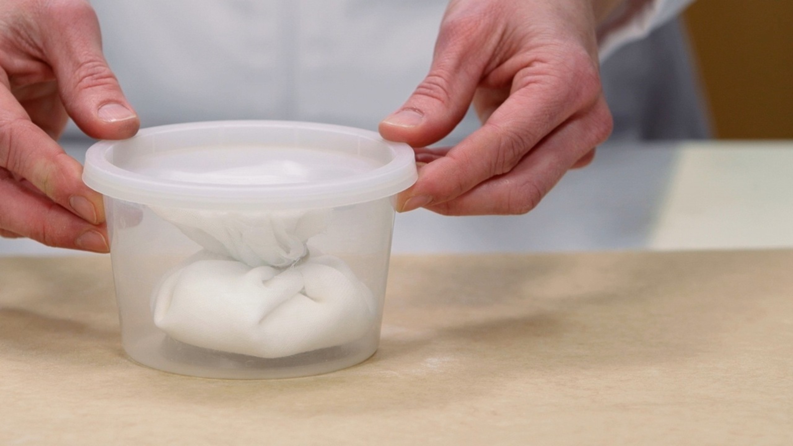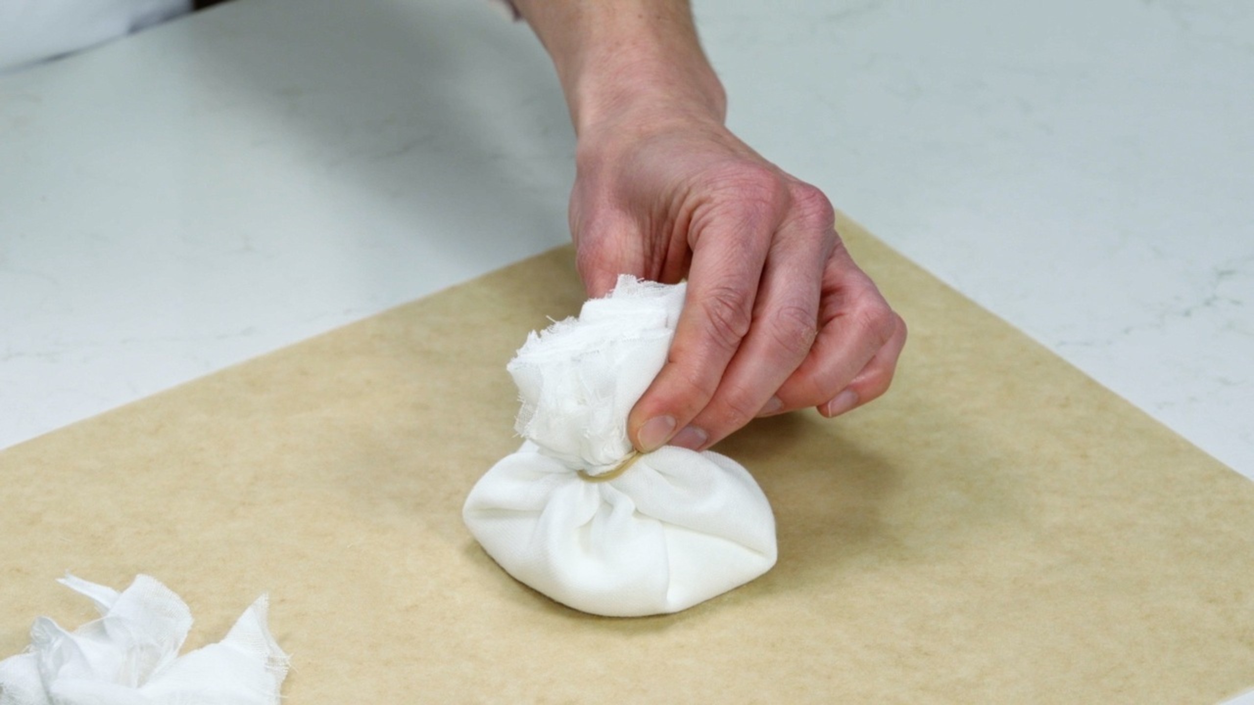 Scale the cornstarch and cut out the four cheesecloth squares.