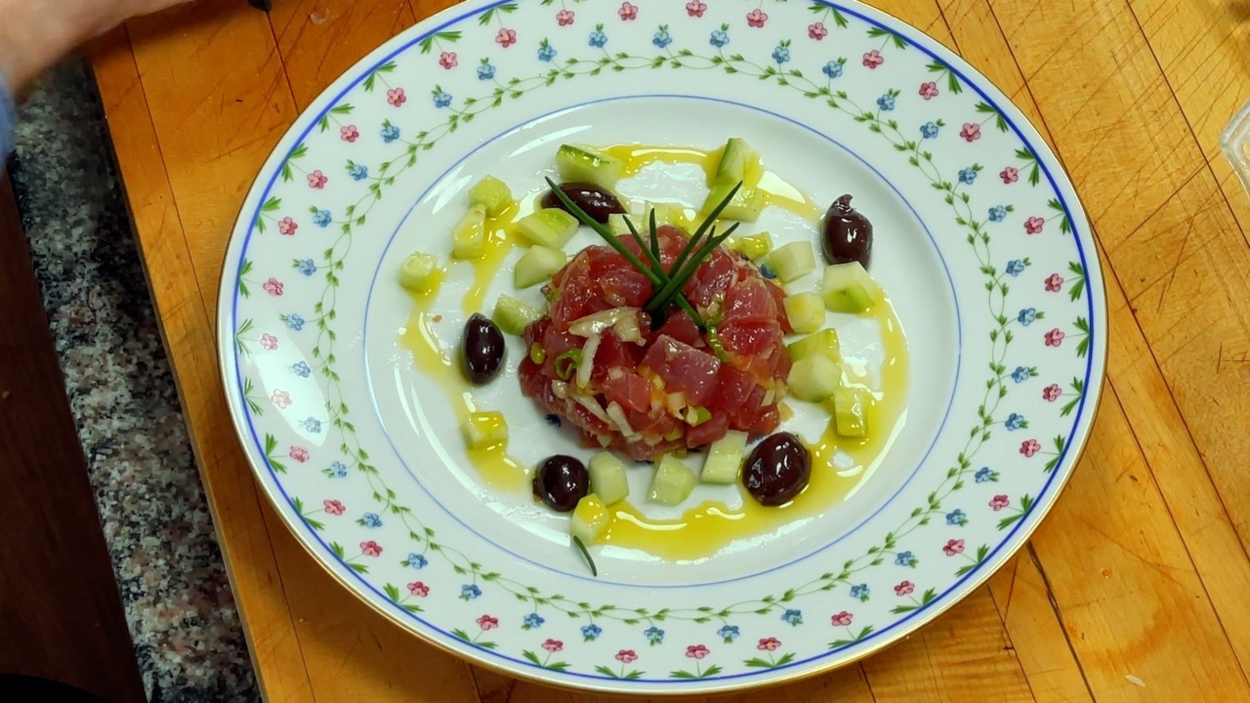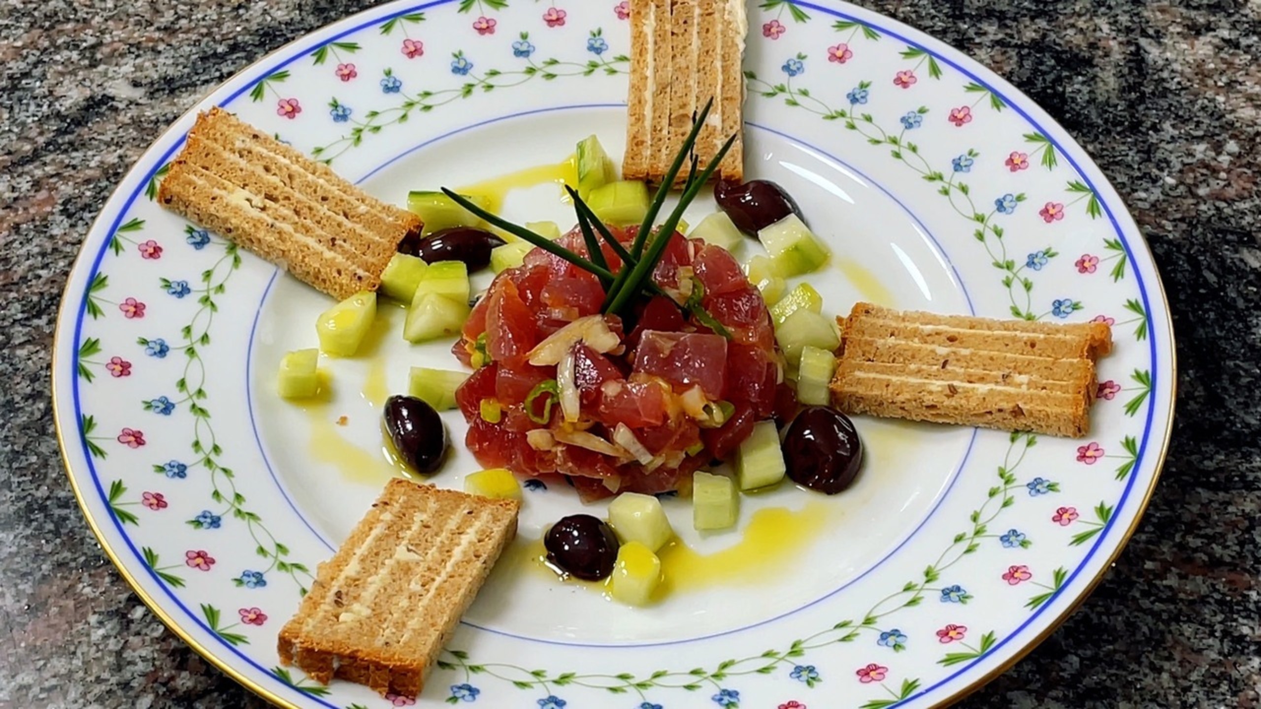 Spoon the tartar into 3 small glass custard cups and press lightly to pack into shape. Carefully unmold the tartar onto 3 plates, and garnish with the diced cucumber, olive halves, and a drizzle of olive oil. Put some chives on top. Slice the bread vertically to reveal the layers of bread and butter and arrange on the plate. Squeeze lemon juice on top just before serving.