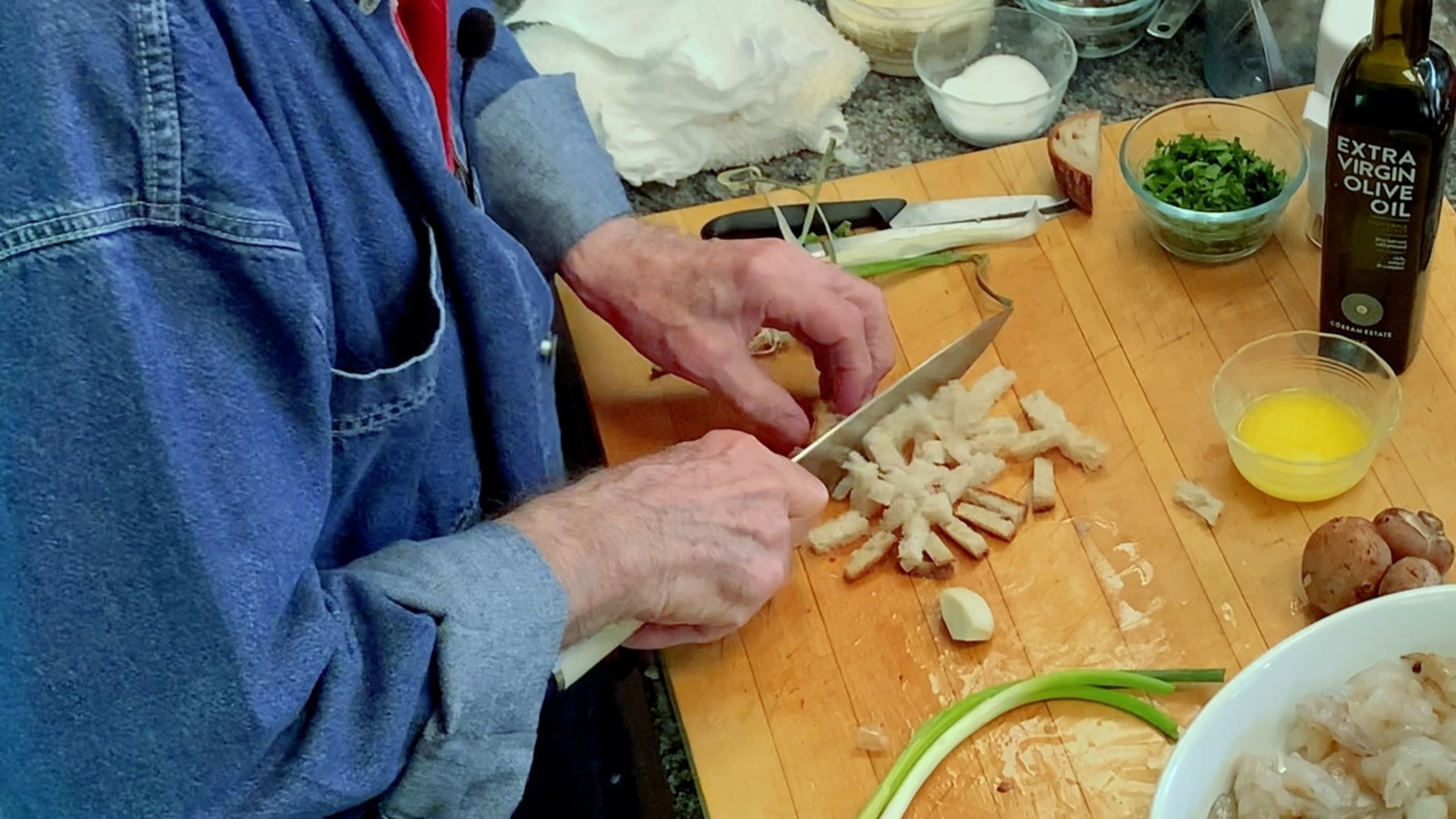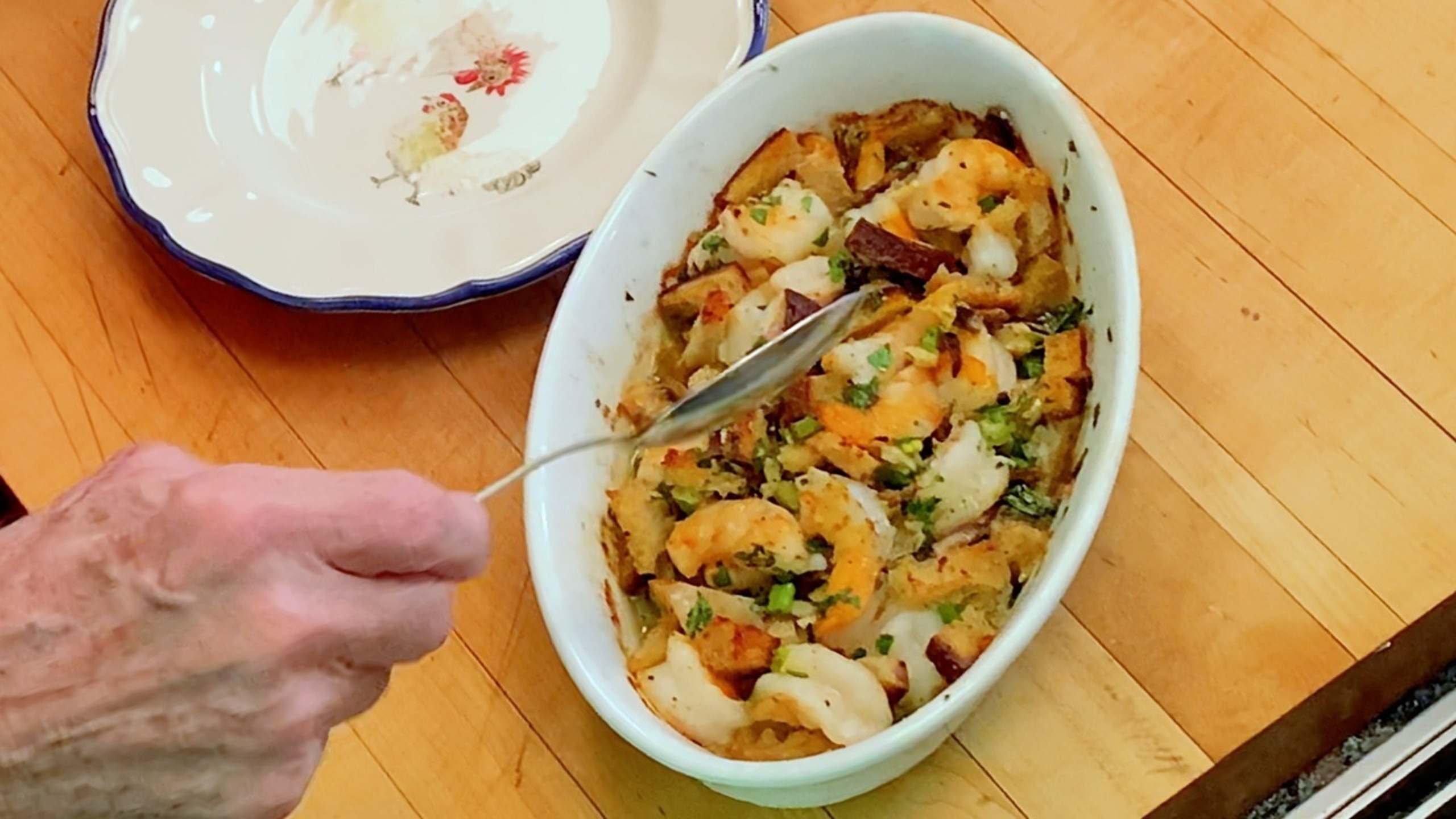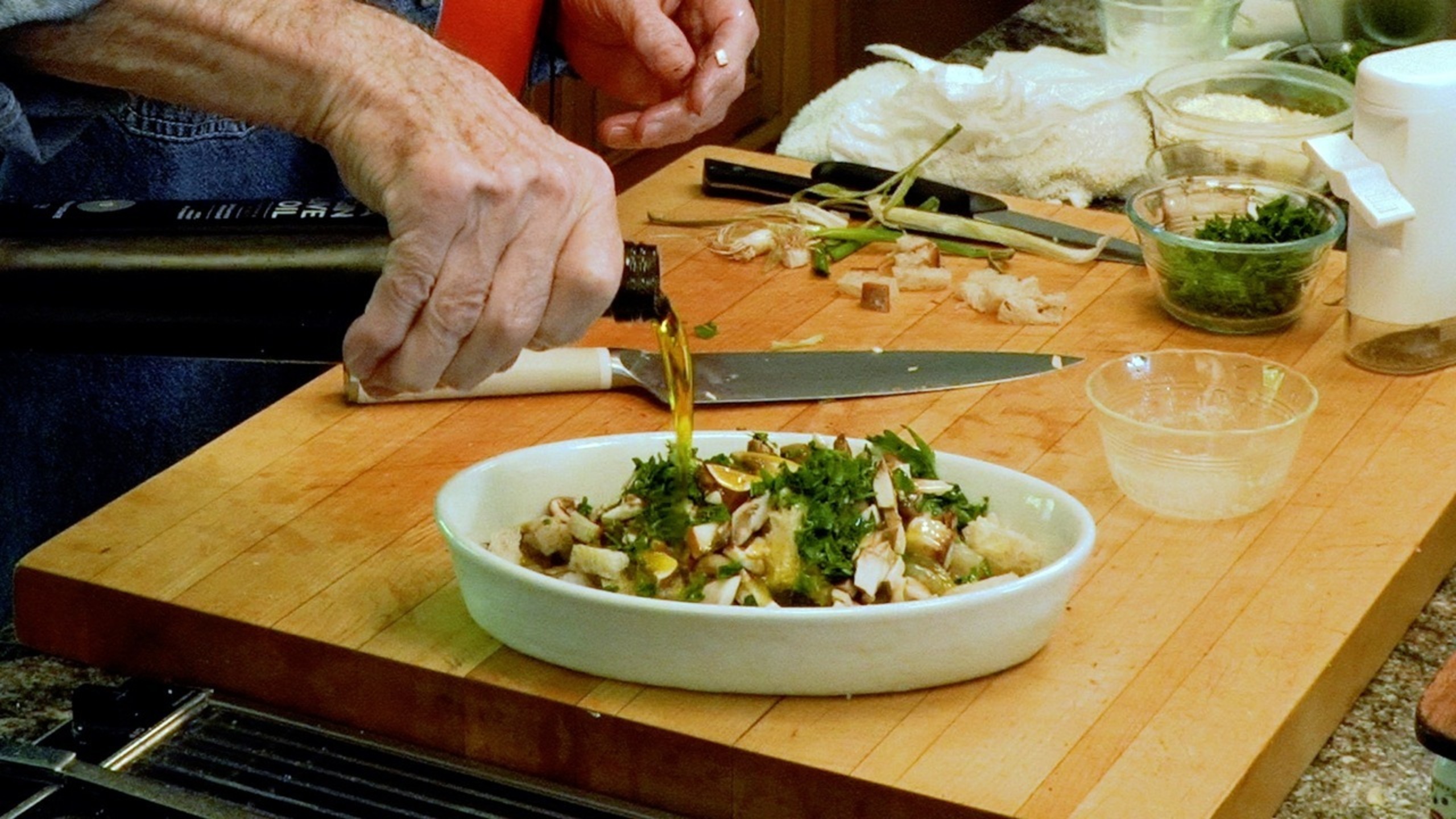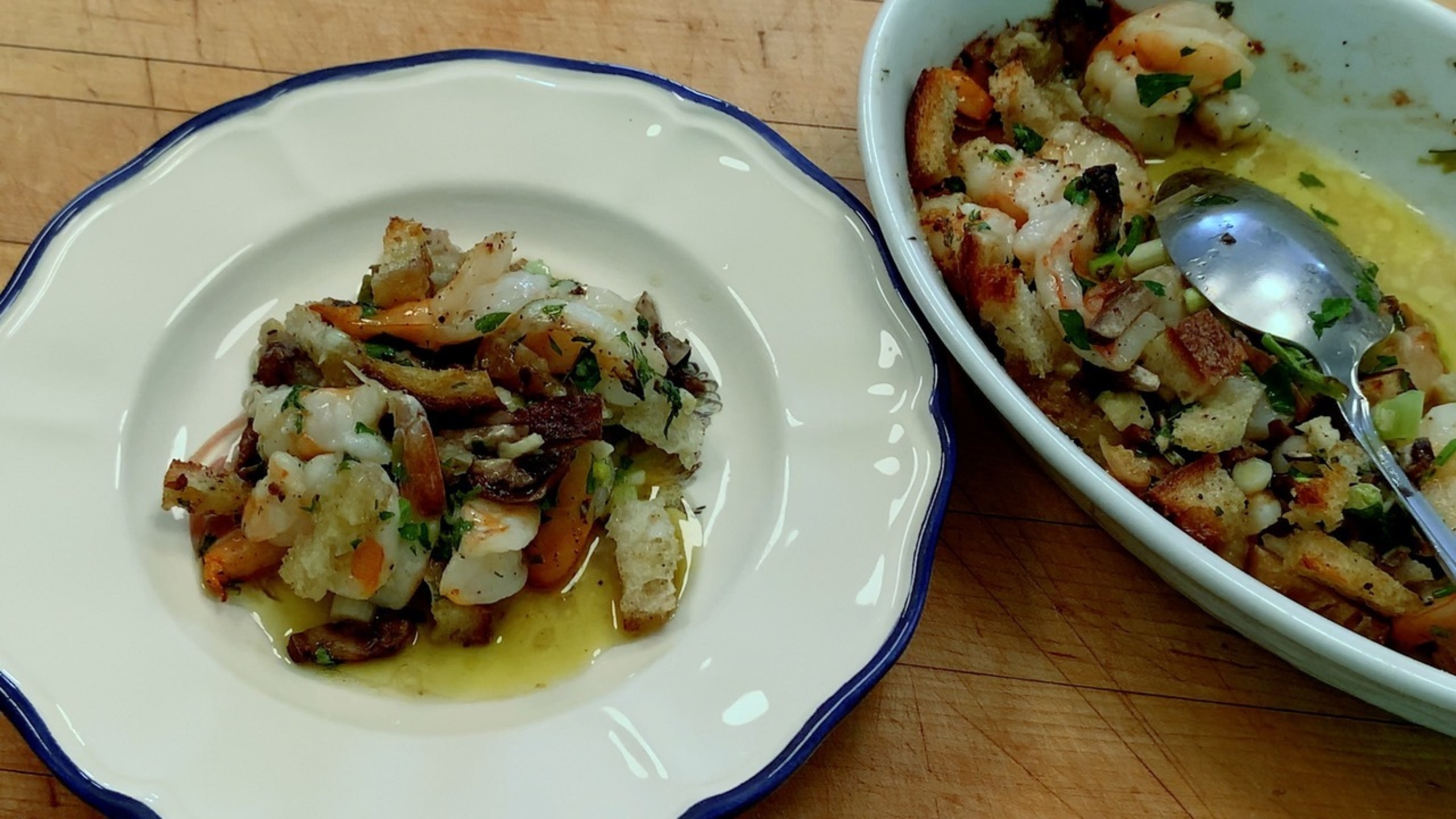 Cut the shrimp in half and place it in a small (4-cup) gratin dish. Add the bread, garlic, scallions, mushrooms, parsley, butter, and olive oil. Season with salt and pepper and stir them together well.