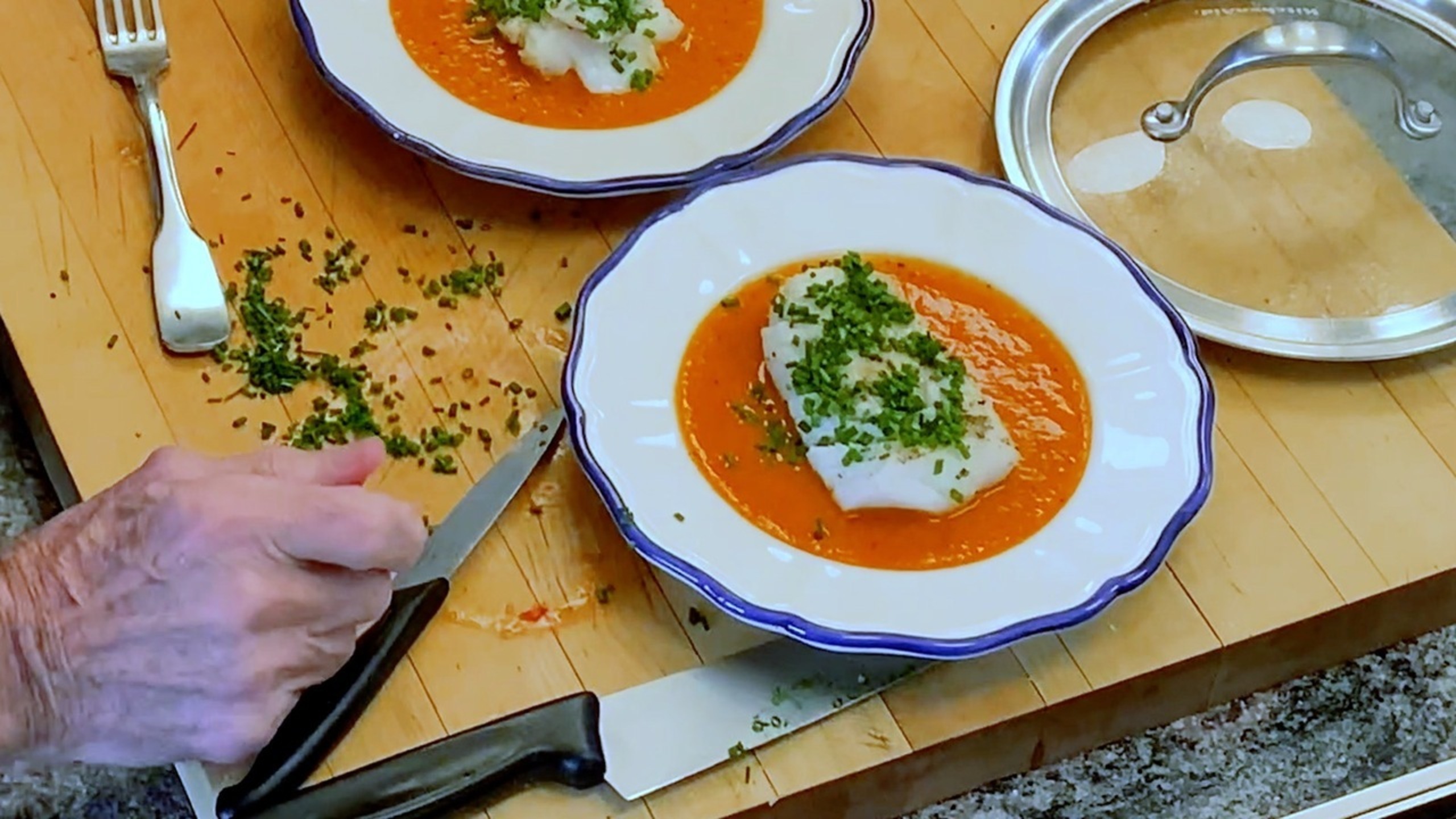 Pour the sauce onto 2 warm plates and set the fish on top. Sprinkle with chives and serve immediately.