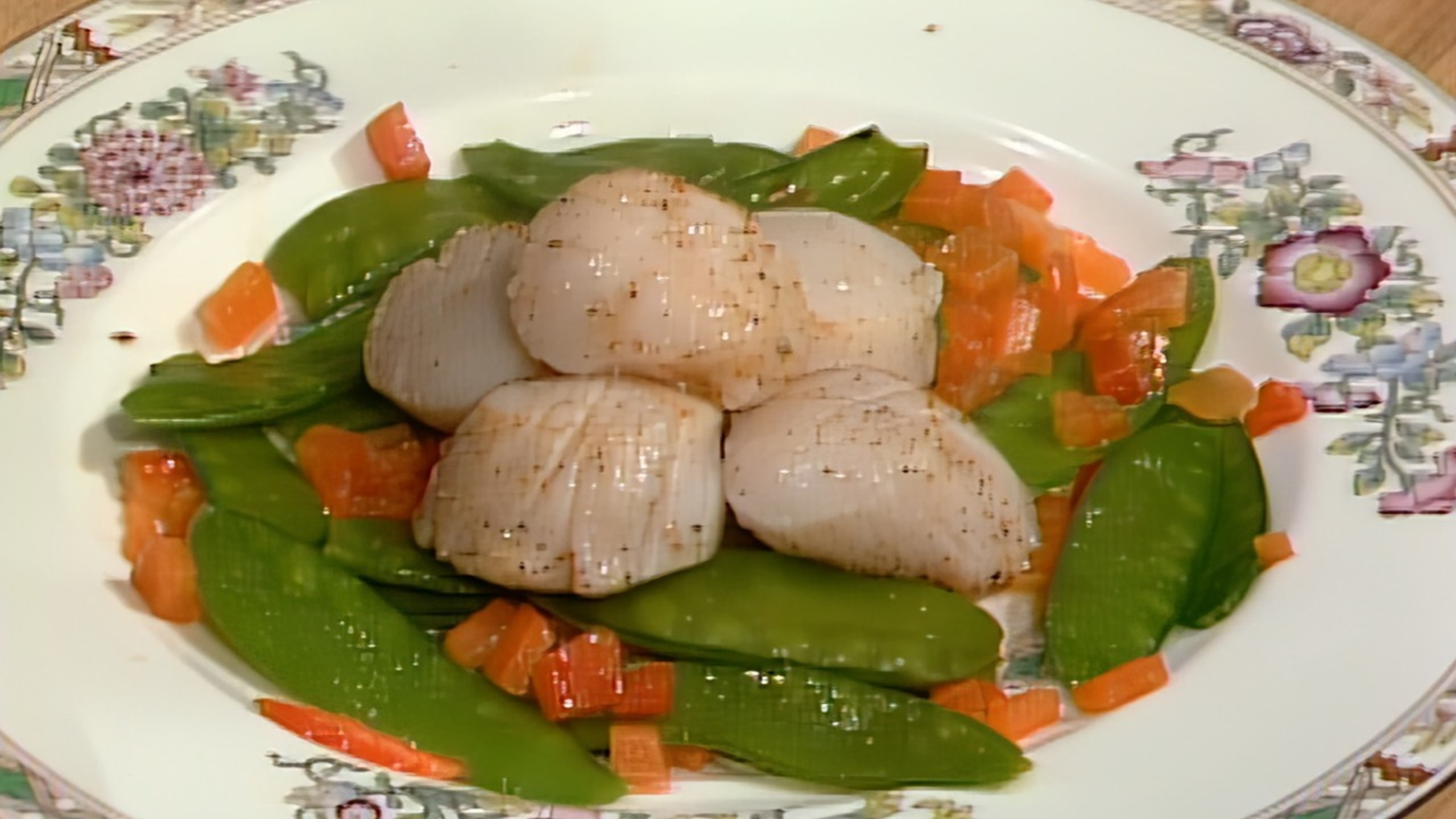 Divide the snow pea-pepper mixture among four plates, top with the scallops and serve immediately.