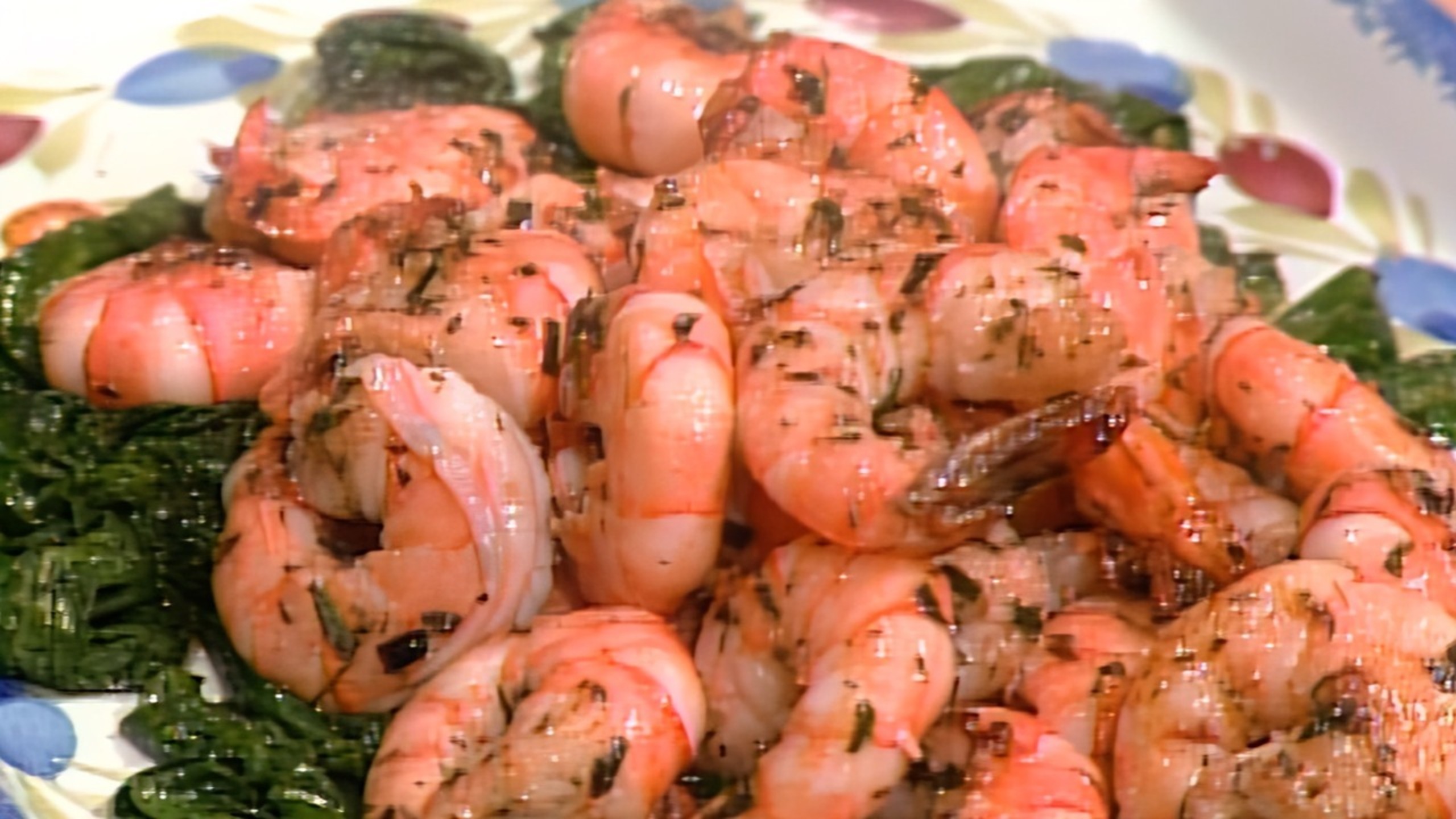 Heat the same pan over high heat until very, very hot. Sprinkle some salt over the marinated shrimp, place them in one layer in the skillet and cook until they are pink about 1 minute. Turn and cook on the other side until pink, another 1 to 1 ½ minutes. Arrange the shrimp over the spinach.