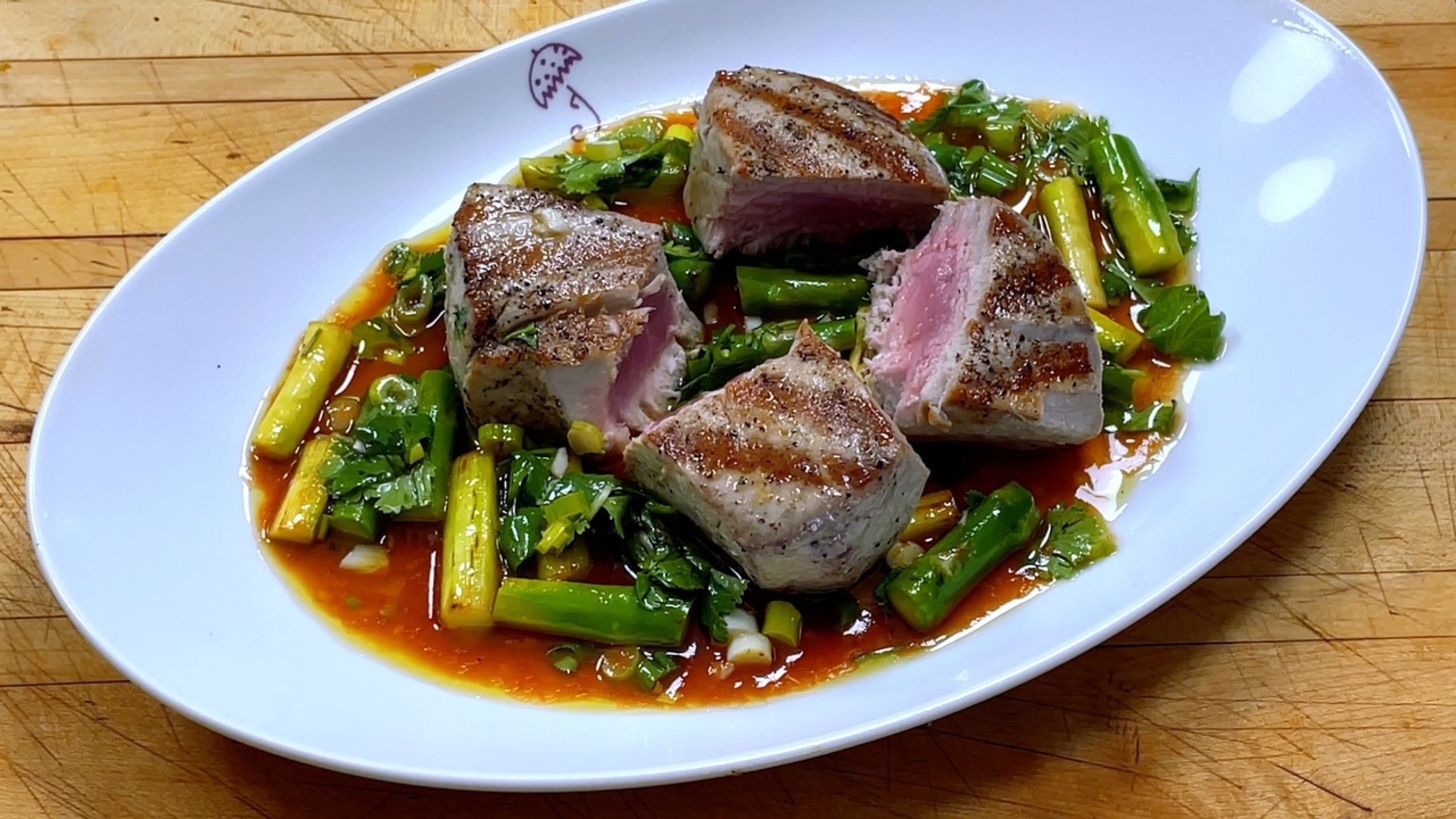 Cut the tuna steak into two thick steaks and sprinkle with salt, sprinkle generously with pepper, and drizzle with olive oil. Heat a grill pan or cast-iron skillet over high heat. When very hot, add the tuna and cook for 2 to 3 minutes on the first side. Turn the tuna and cover it with a metal bowl. Add the asparagus to the grill pan and cook for about 2 minutes or to your liking.