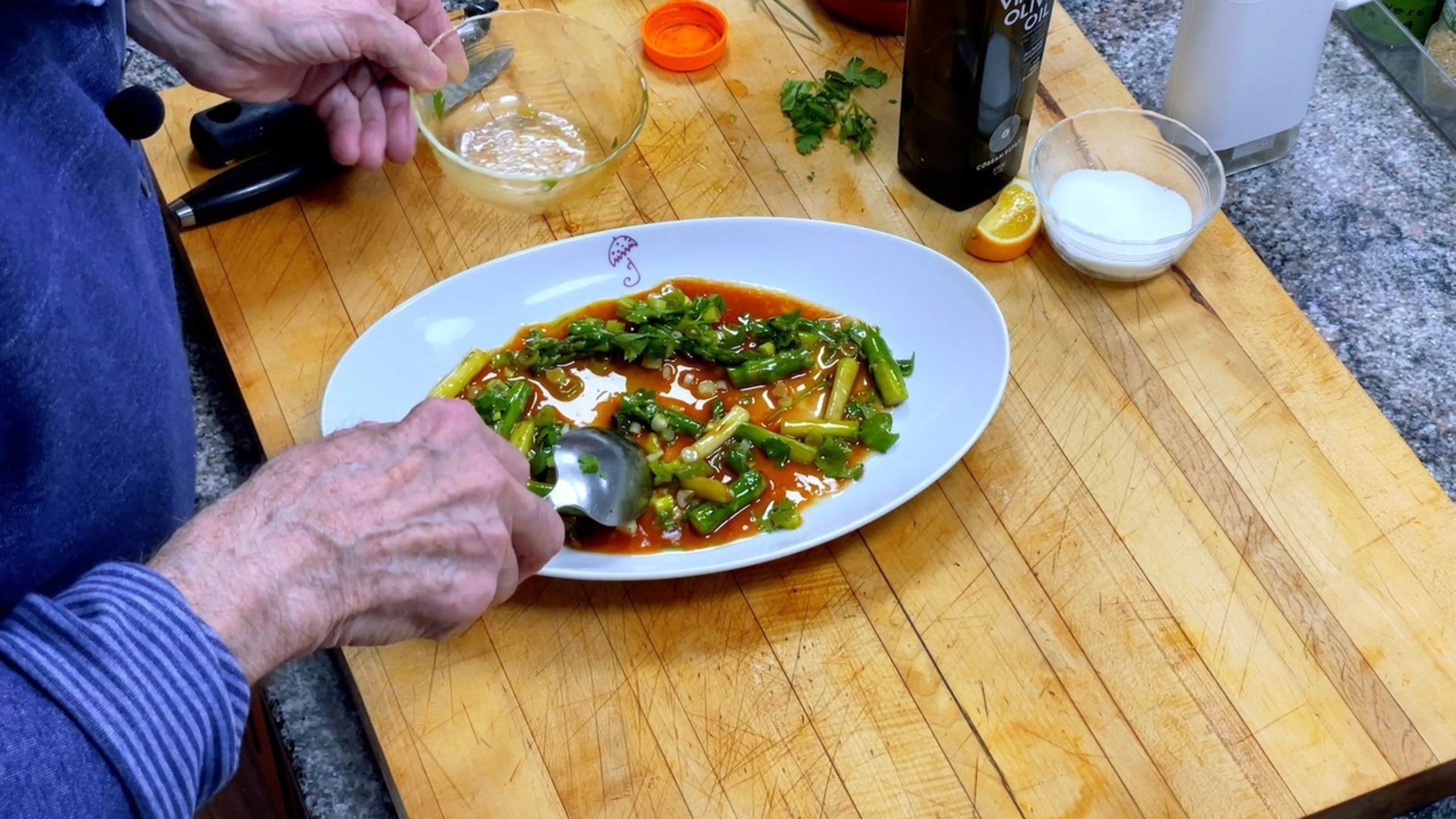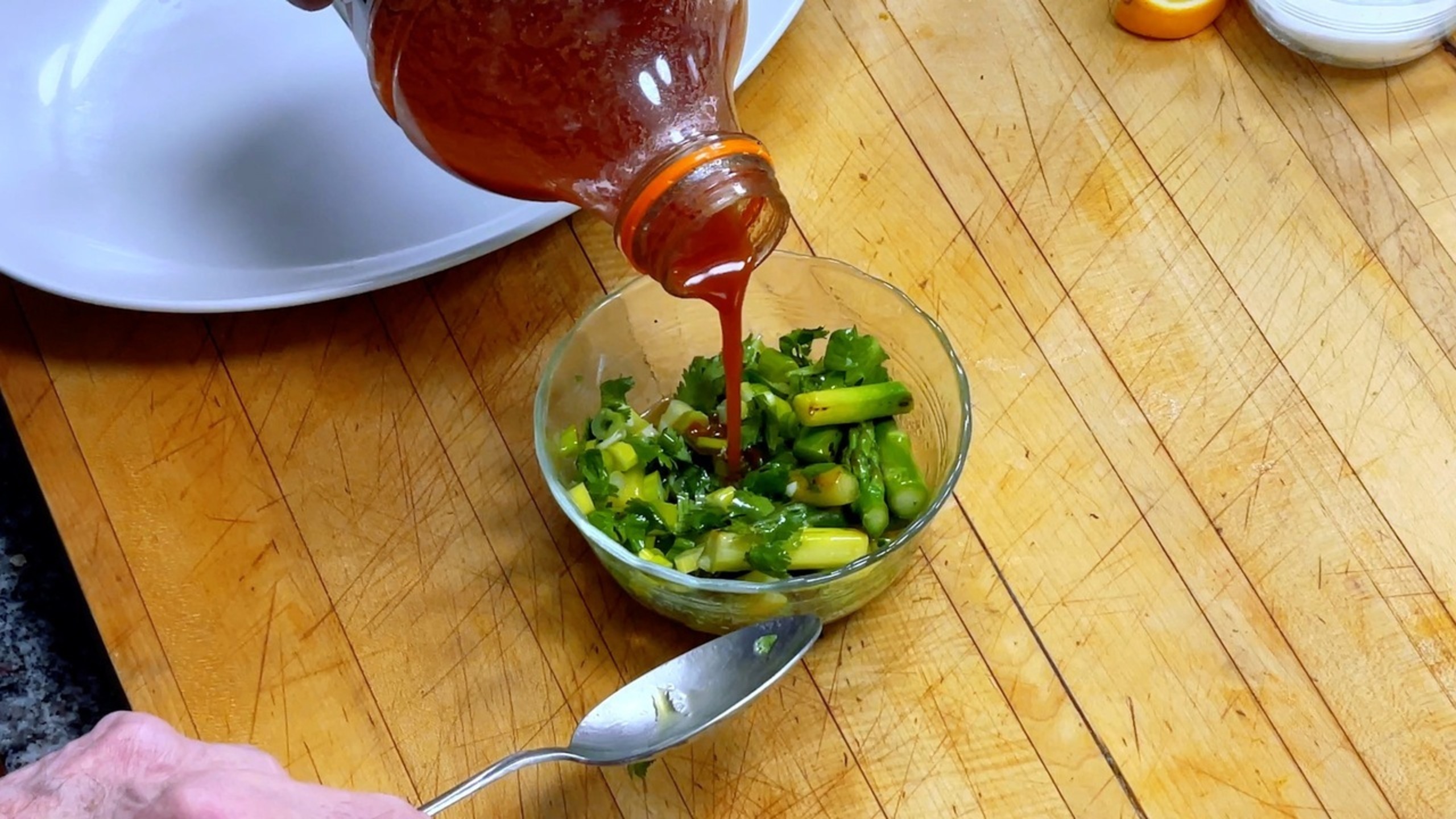 While the tuna and asparagus are cooking, prepare the sauce. In a small bowl, combine the scallions, garlic, cilantro, lemon juice and olive oil. Add the cooked asparagus and V8, then stir to coat.