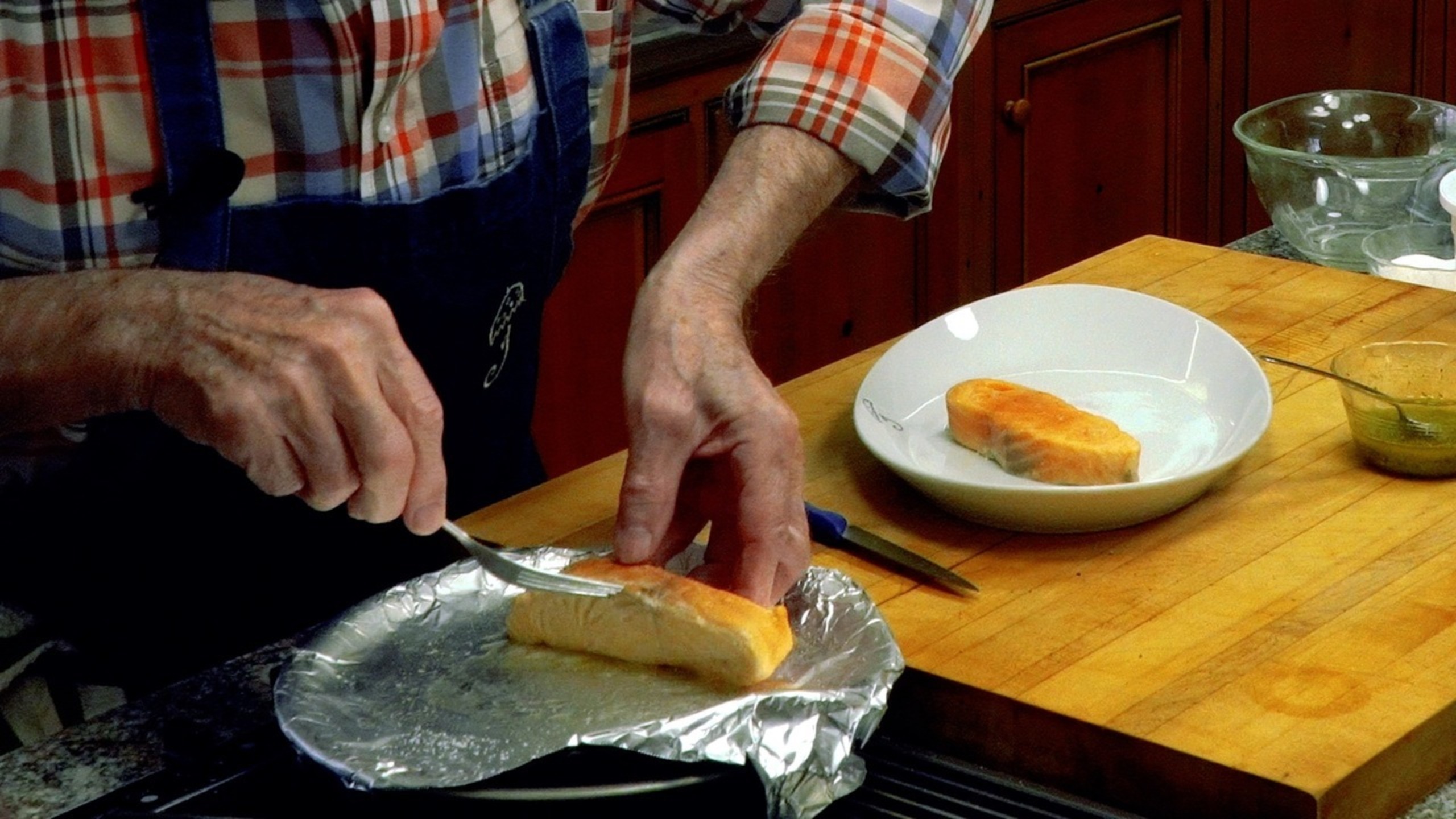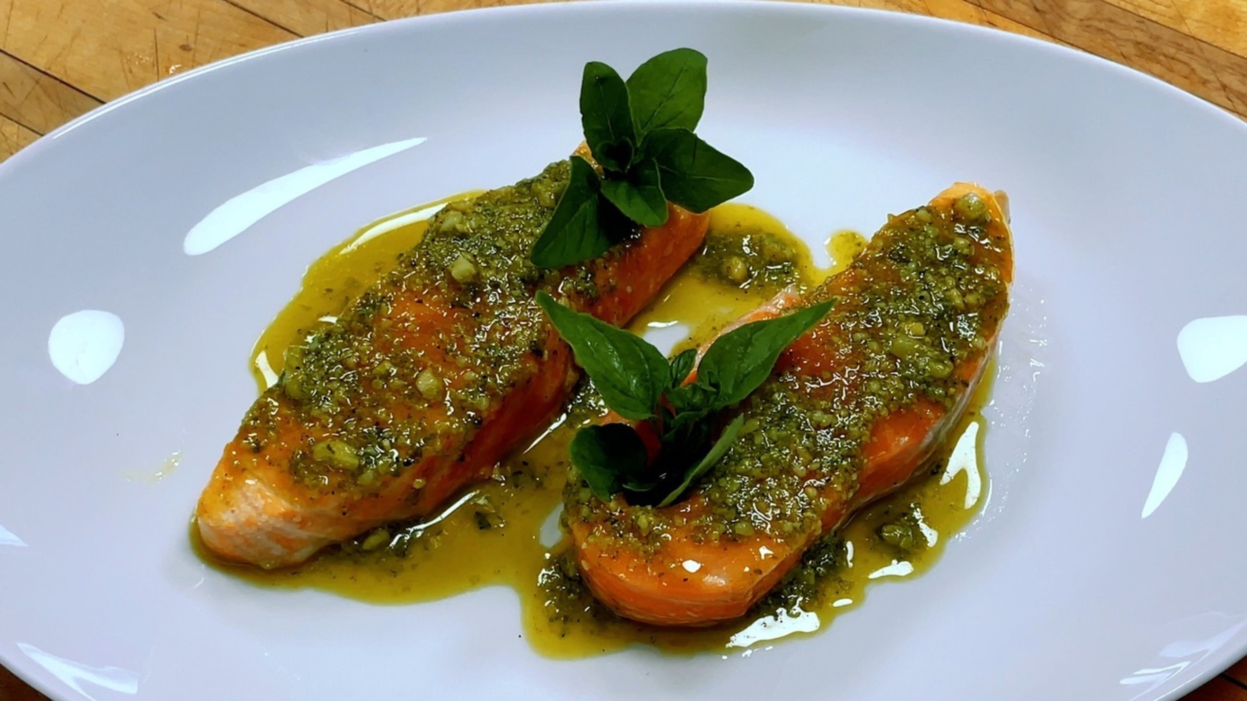While the salmon cooks, melt the butter in the microwave and then stir in the pesto to make the sauce. Place the salmon on a platter or individual plates; spoon the sauce over the salmon.