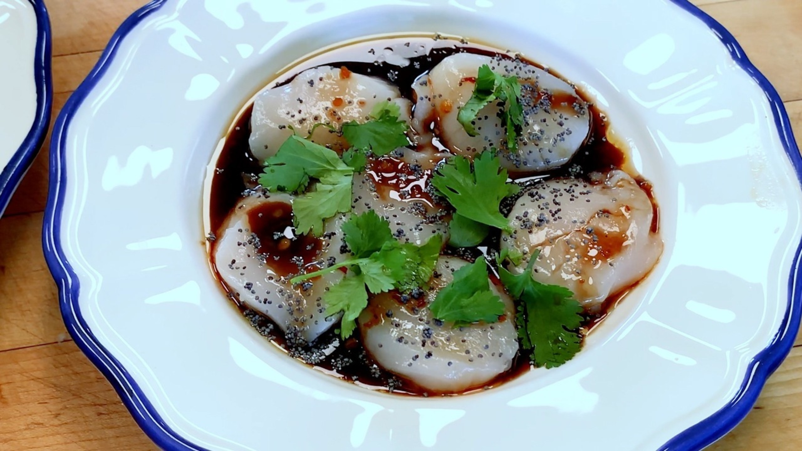 In a small bowl, combine the chili-garlic sauce, rice vinegar, sesame oil, sugar, and fish sauce. Place a tablespoon of the sauce on two chilled plates.