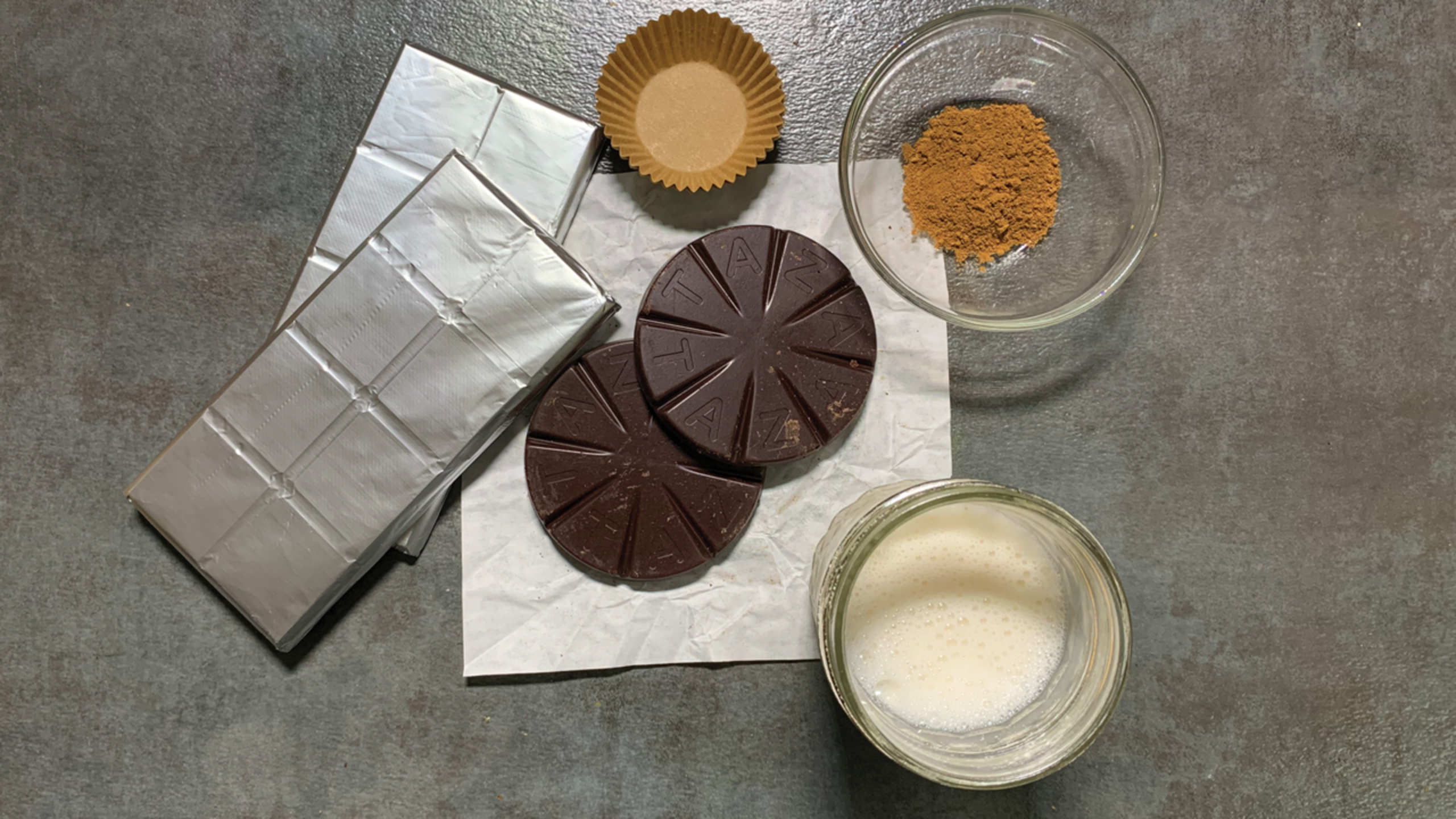 In a saucepan, heat plant milk on a low flame, until it starts to boil around the pan’s edges. Immediately remove from heat, and pour over the chopped chocolate. Stir vigorously to dissolve the chocolate into a smooth texture, or ganache.