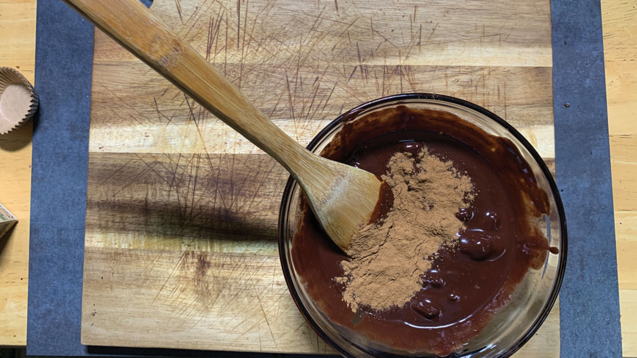 Place finished pieces of chocolate in a glass bowl. Add ground cinnamon and chili powder, and mix into the chocolate. Set aside.